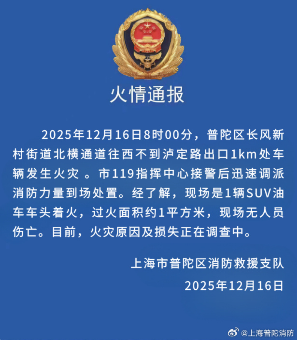 据“上海普陀消防”官方微博发布火情通报:2025年12月16日8时00分,普陀区长风新村街道北横通道往西不到泸定路出口1km处车辆发生火灾 。市119指挥中心接警后迅速调派消防力量到场处置。经了解,现场是1辆SUV油车车头着火,过火面积约1平方米,现场无人员伤亡。目前,火灾原因及损失正在调查中。