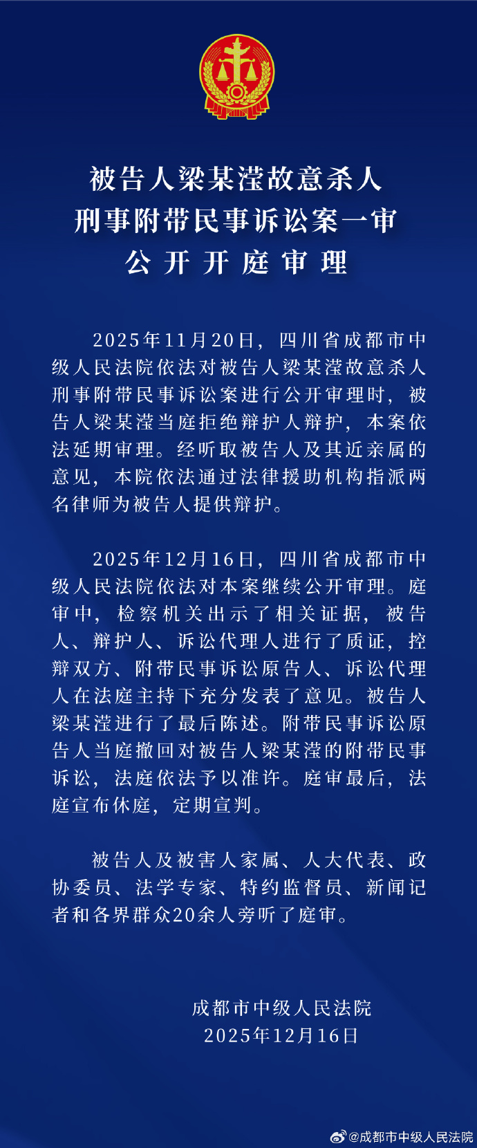 据成都市中级人民法院12月16日消息,当天,该院对被告人梁某滢故意杀人刑事附带民事诉讼案一审继续公开审理。