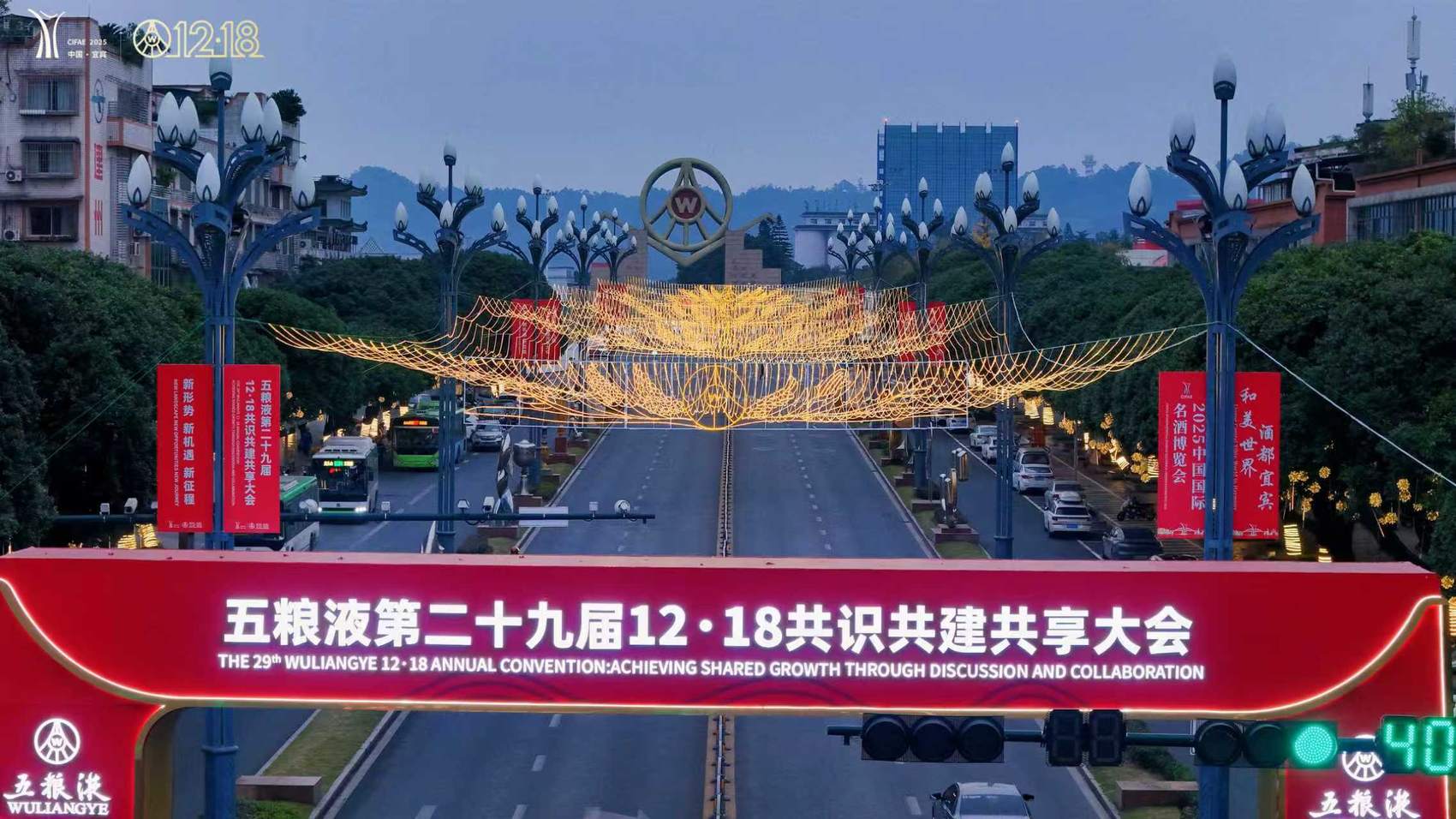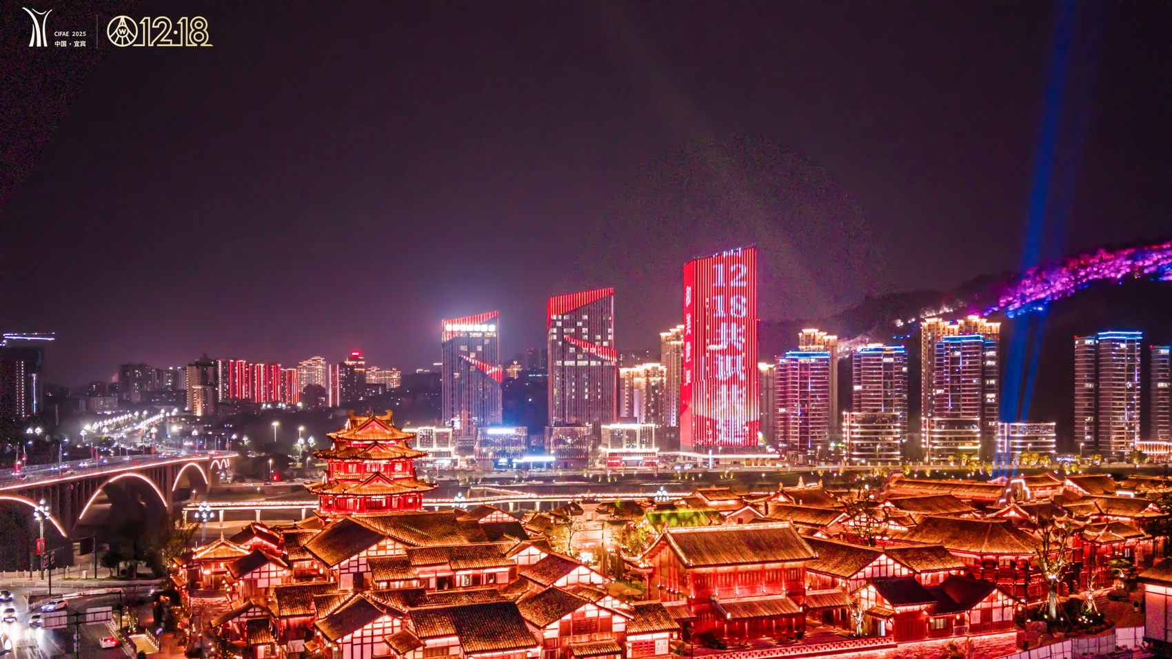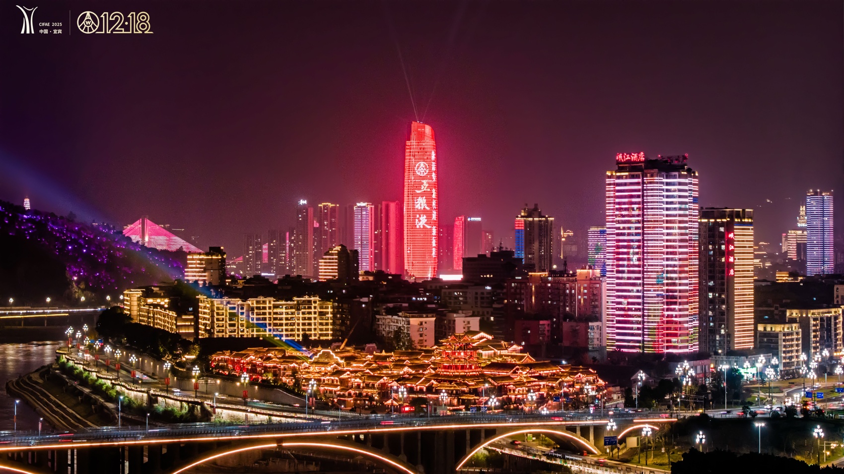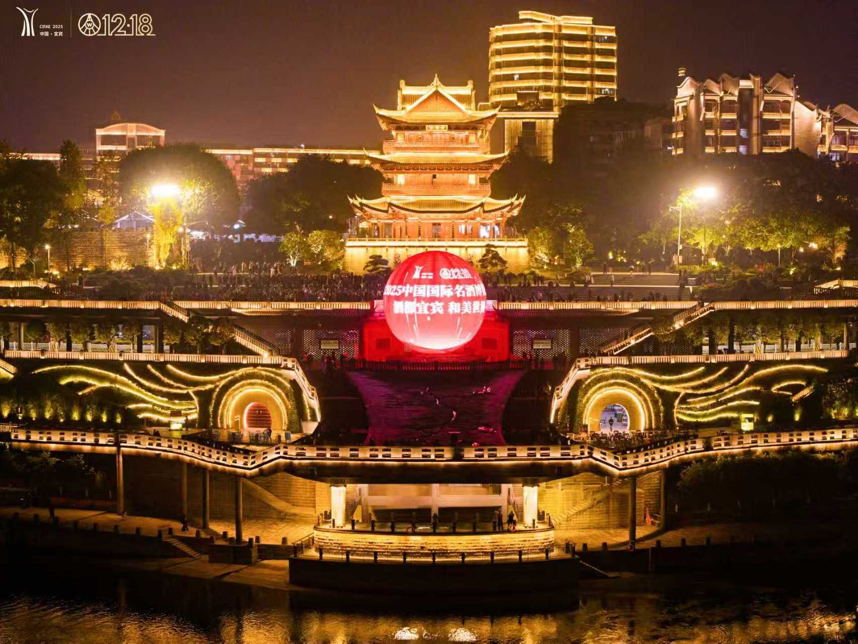 在城市核心地段三江口两岸,地标建筑的LED大屏上,五粮液12·18大会主题语循环流转,将和美温情的氛围传递给江畔来客。