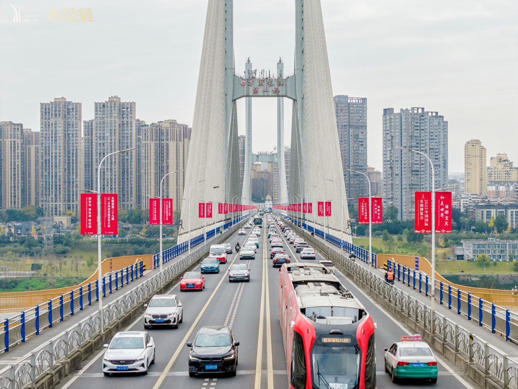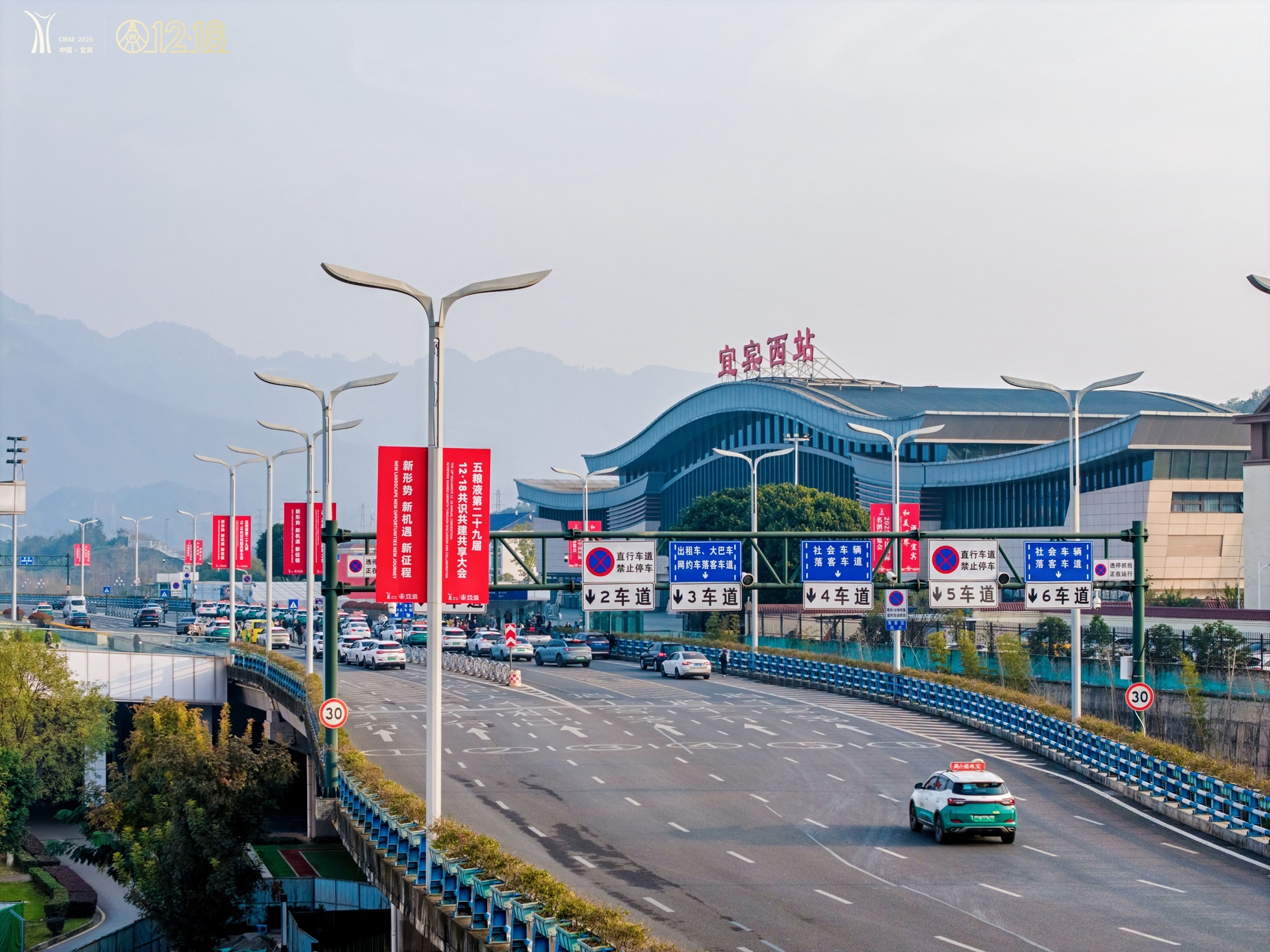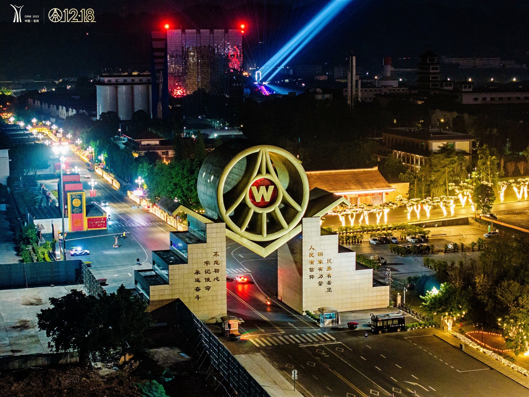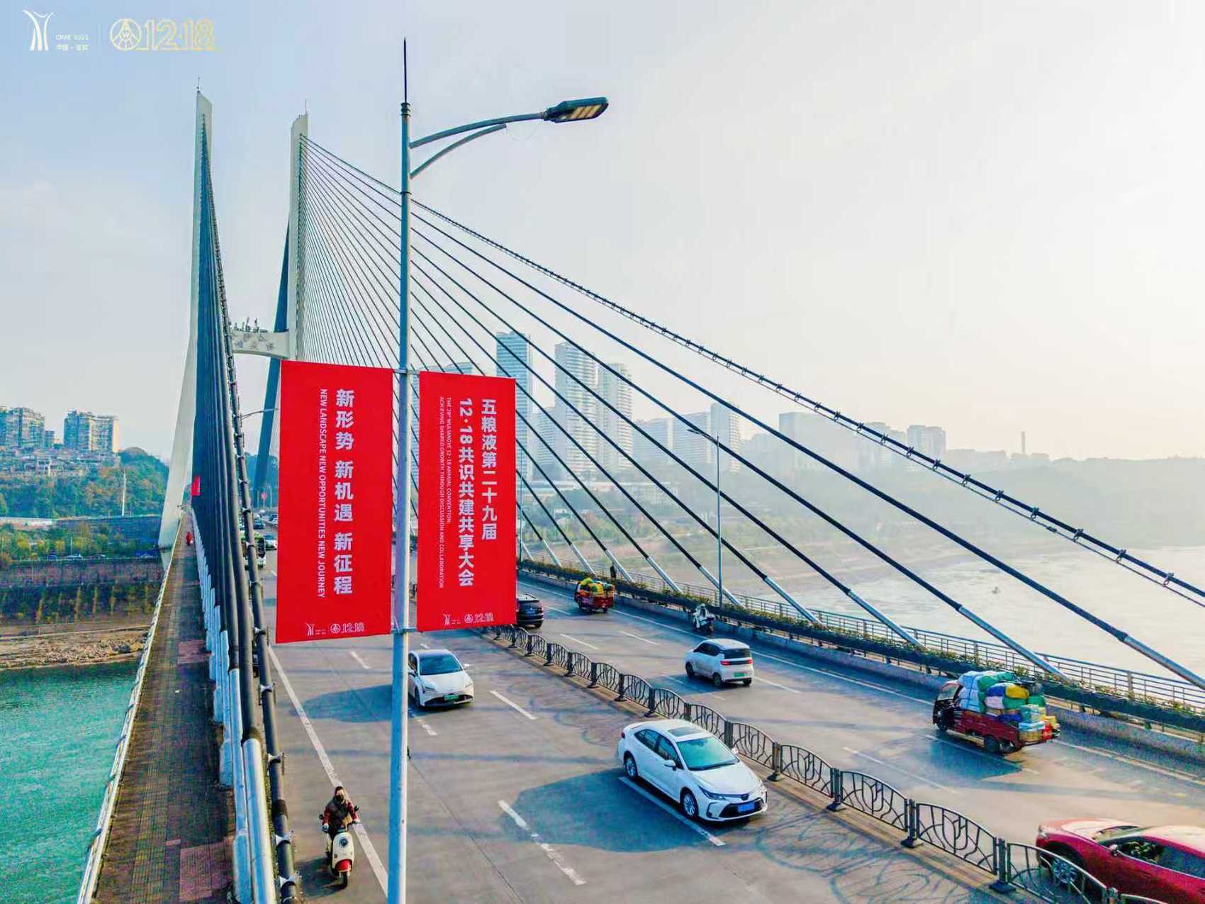 为了迎接这场盛会,宜宾也换上“盛装”,为五粮液12·18大会营造浓郁氛围。在城市各大核心商圈和机场、高铁等城市地标,一系列以五粮液为主题的装置错落铺展。