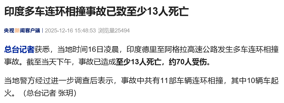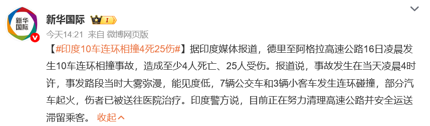 据印度媒体报道,德里至阿格拉高速公路16日凌晨发生10车连环相撞事故,造成至少4人死亡、25人受伤。