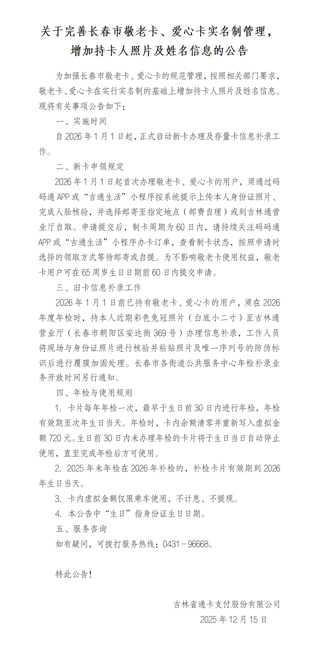 1. 自2026年1月1日起,长春市敬老卡、爱心卡将增加持卡人照片与姓名信息。