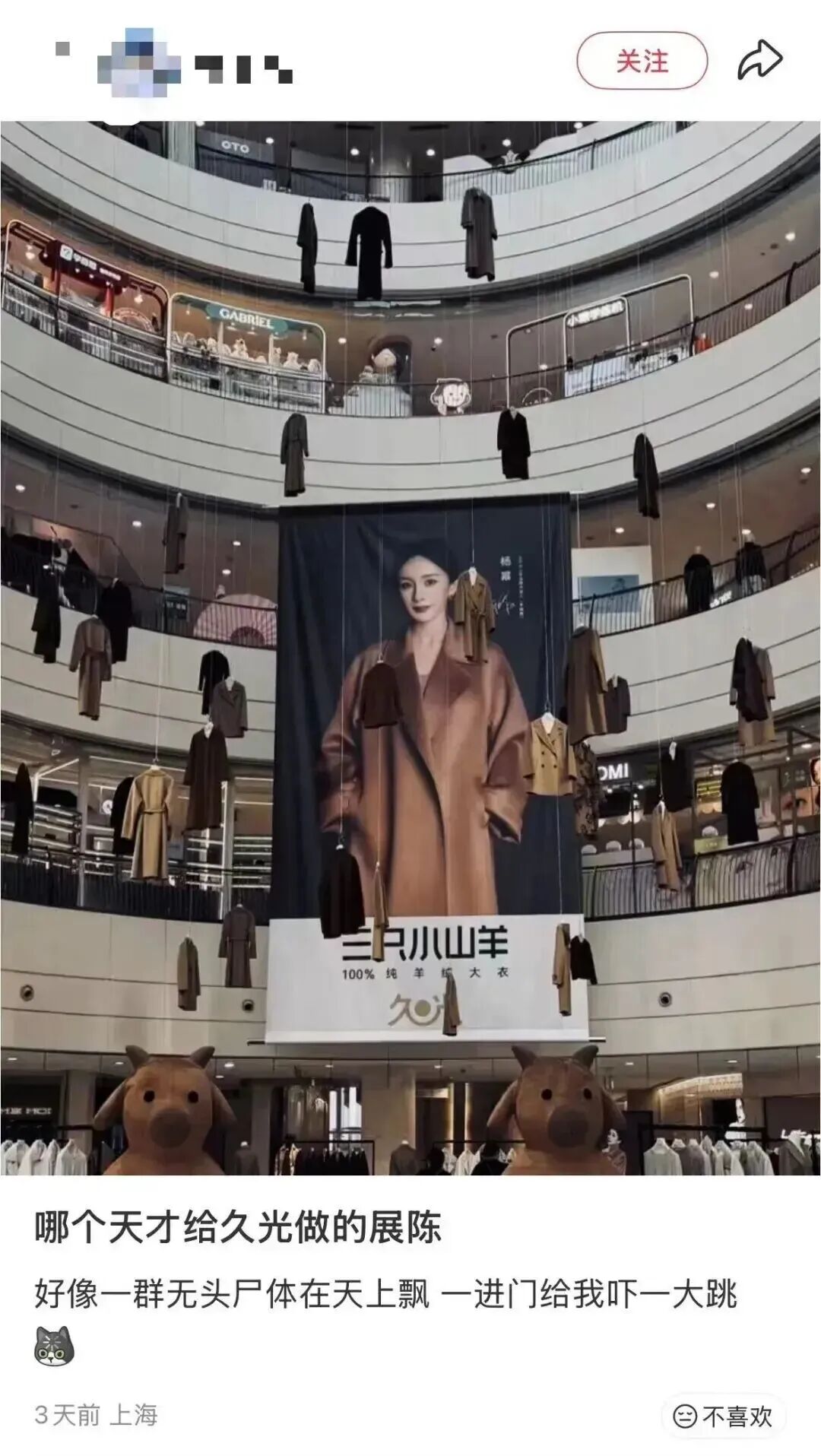 近日,有网友发帖反映,上海南京西路久光百货商场中庭悬挂着数十件长大衣,这些大衣悬挂高度不一,错落分布在整个中庭空间,中间是品牌代言人的巨幅海报,奇特的布置让不少网友直呼气氛诡异,有点吓人。