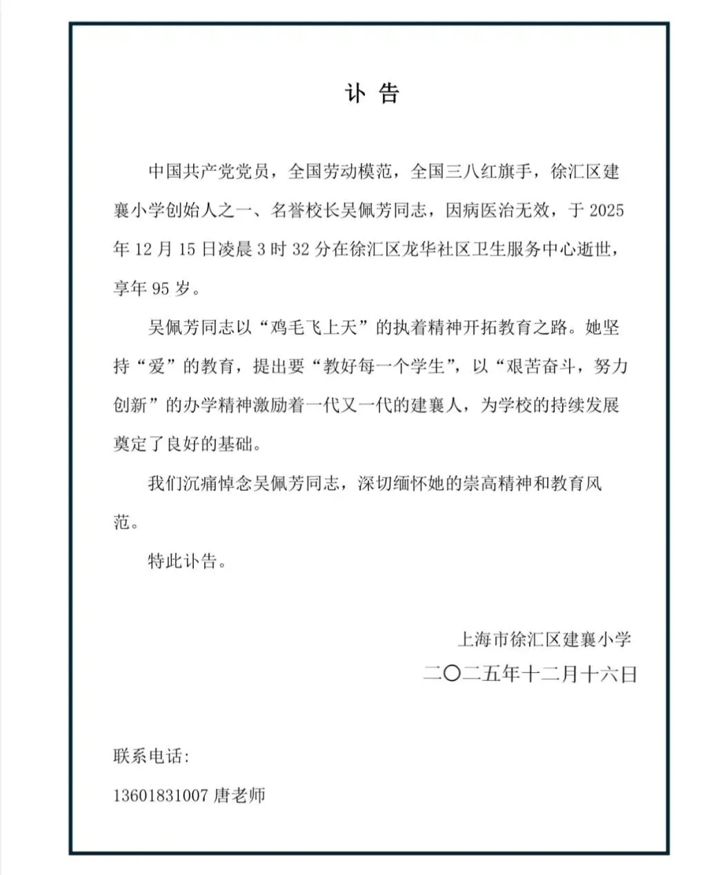 今天,“徐汇区建襄小学”微信公众号发布讣告。讣告称,吴佩芳以“鸡毛飞上天”的执着精神开拓教育之路。她坚持“爱”的教育,提出要“教好每一个学生”,以“艰苦奋斗,努力创新”的办学精神激励着一代又一代的建襄人,为学校的持续发展奠定了良好的基础。
