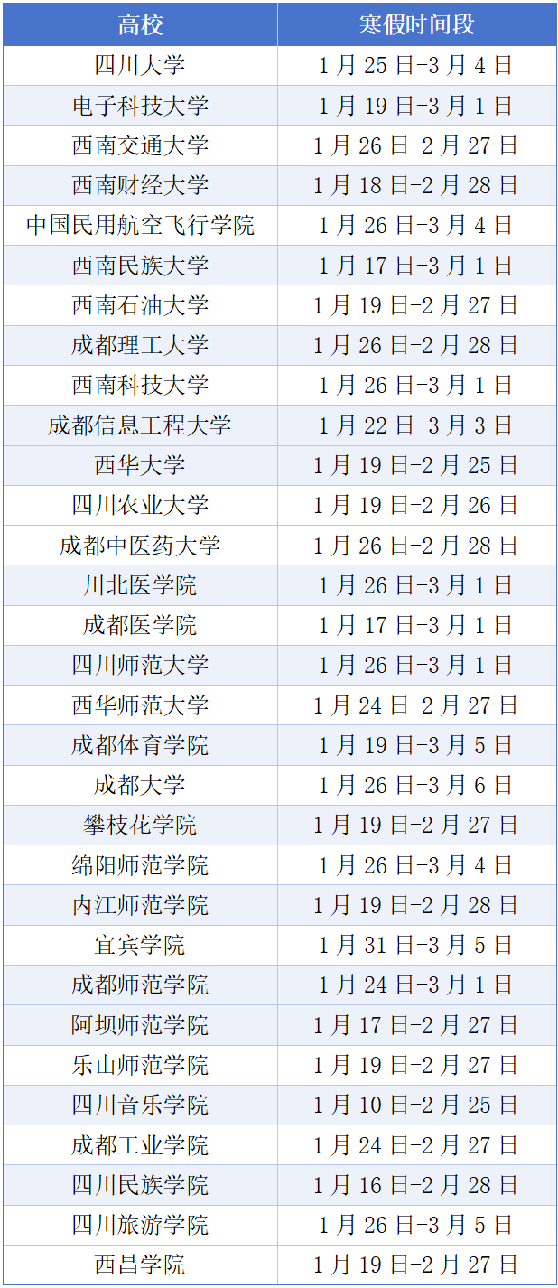 近期,四川省部分高校公布了寒假放假时间,还有一些高校虽然未公布最终的寒假时间。川观新闻记者根据学校公布的校历进行了整理,具体如下表。