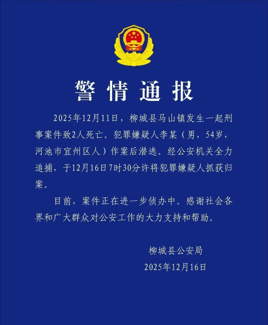 16日柳城警方发布警情通告:2025年12月11日,柳城县马山镇发生一起刑事案件,造成2人死亡。犯罪嫌疑人李某(男,54岁,河池市宜州区人)已于12月16日7时30分许被公安机关抓获归案。
