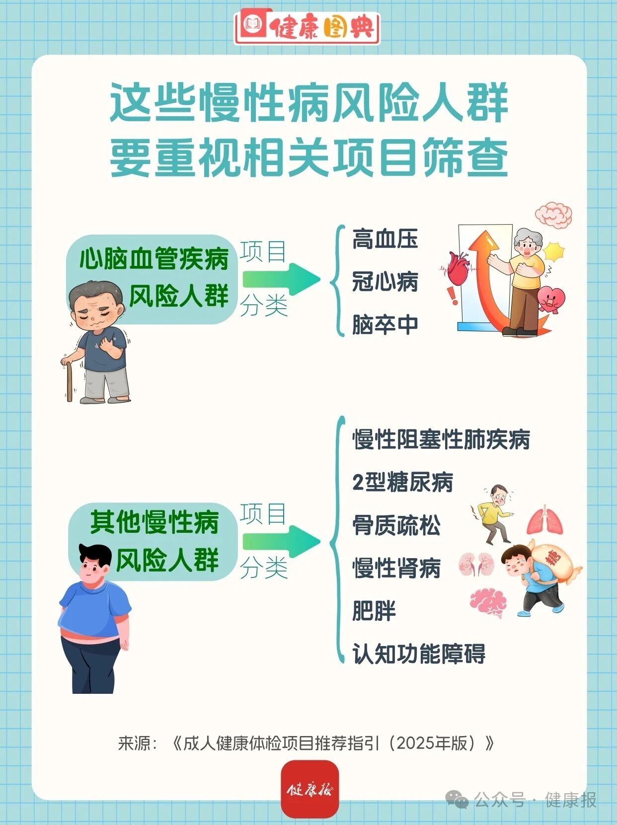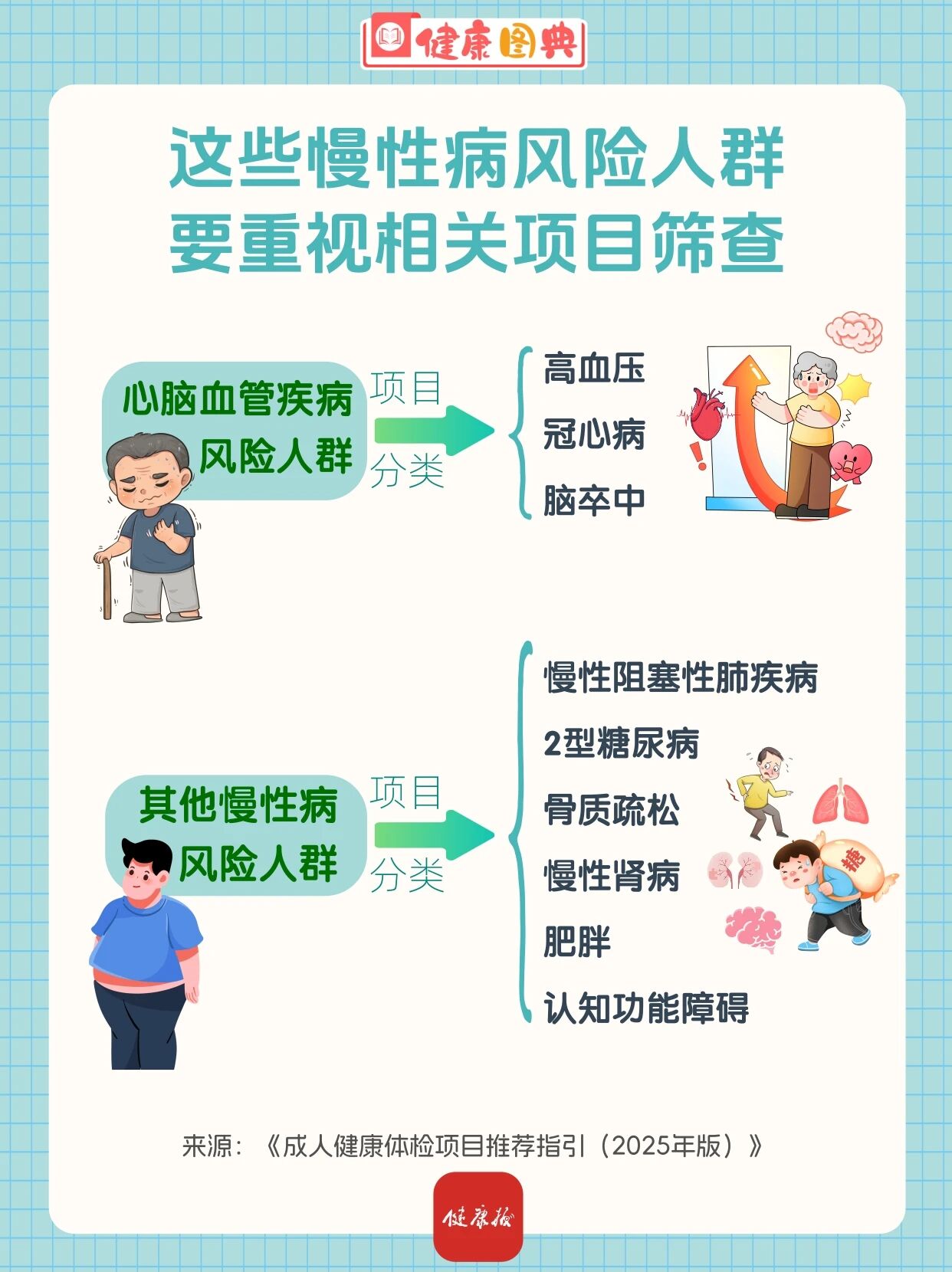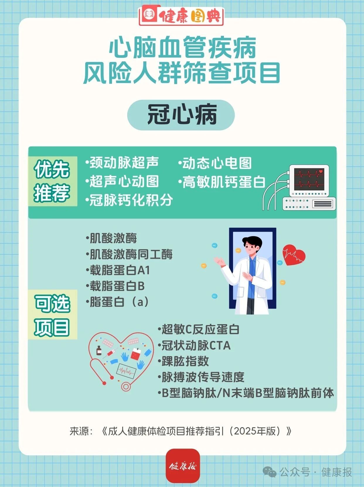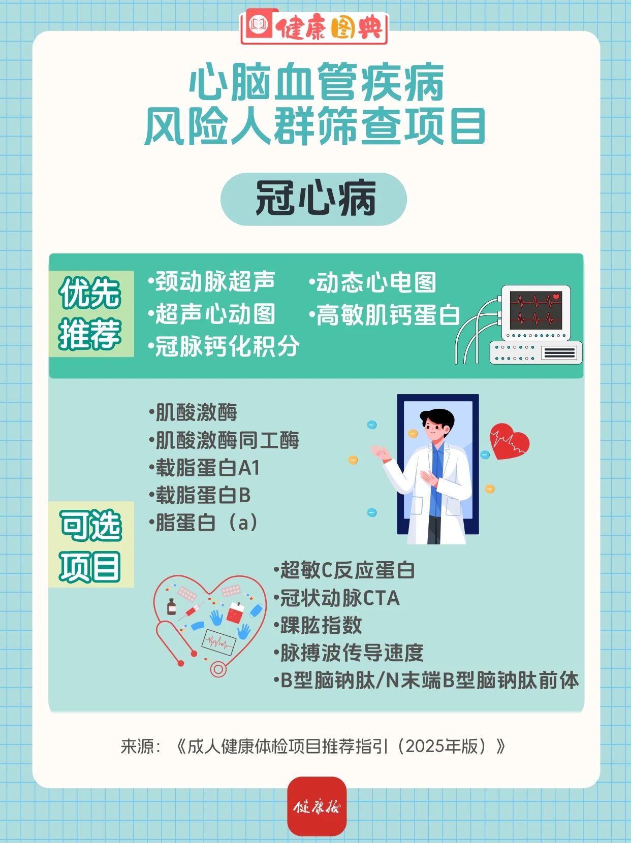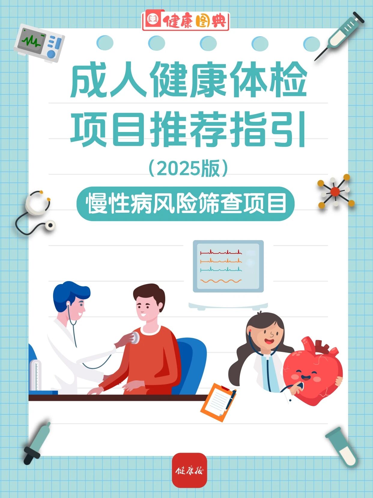 近期,国家卫生健康委办公厅印发《成人健康体检项目推荐指引(2025年版)》,进一步规范健康体检行为,维护受检者健康权益。根据新版《指引》,慢性病风险筛查项目包括心脑血管疾病风险人群筛查项目、常见恶性肿瘤风险人群筛查项目、其他慢性病风险人群筛查项目。本期健康图典栏目为大家详细解读心脑血管疾病风险人群和其他慢性病风险人群筛查项目。左右滑动上方图片可阅读相关内容。往期内容:成人基本体检项目该做哪些?这份权威《指引》给出答案!建议收藏→出品:健康报社制图/编辑:李诗尧(部分图片由AI生成)审核:徐秉楠