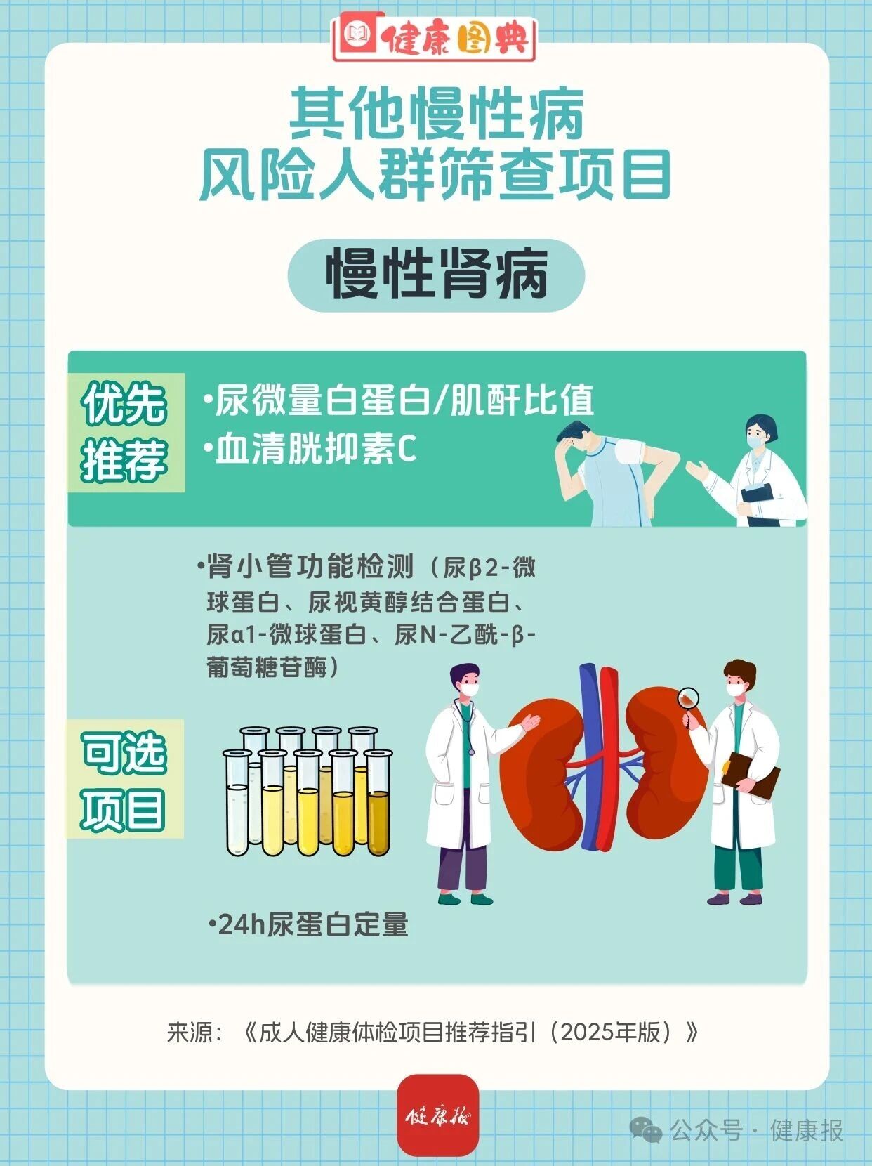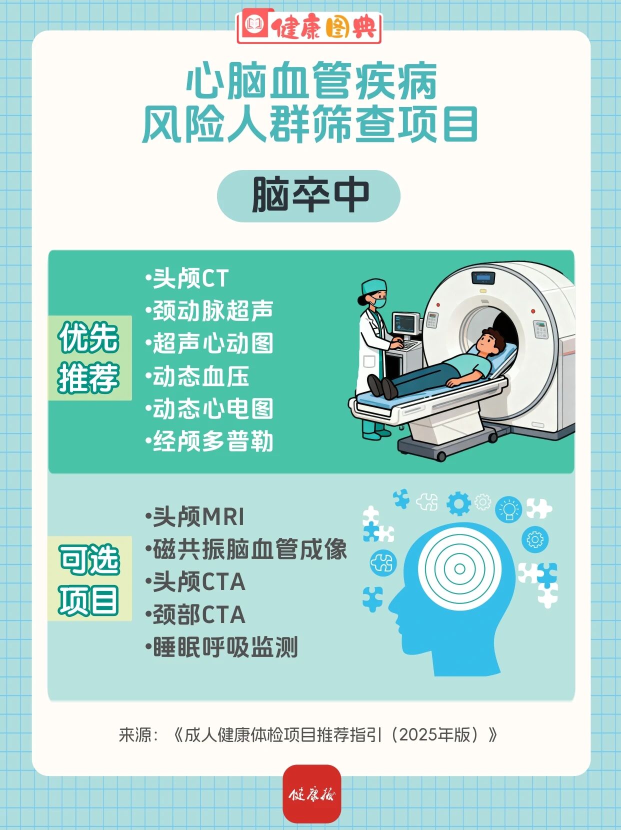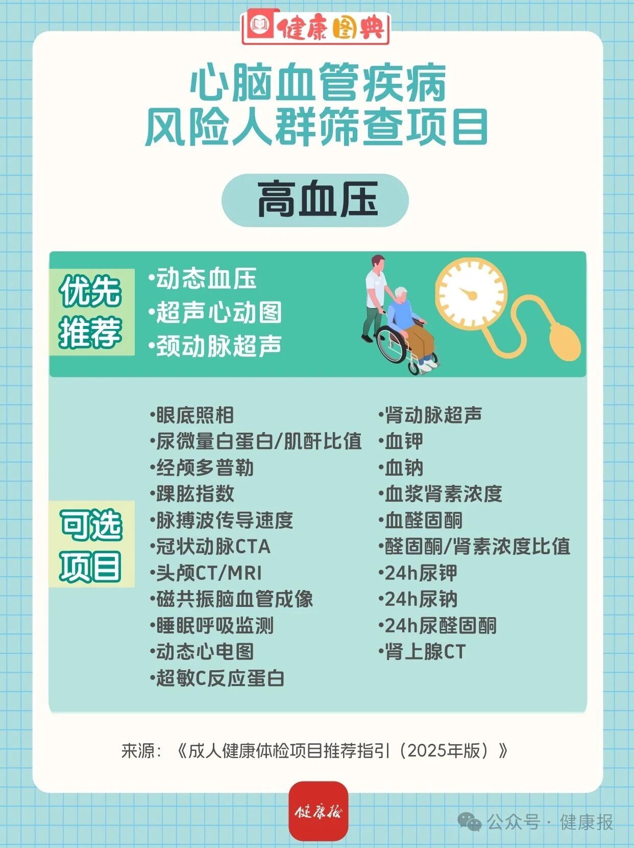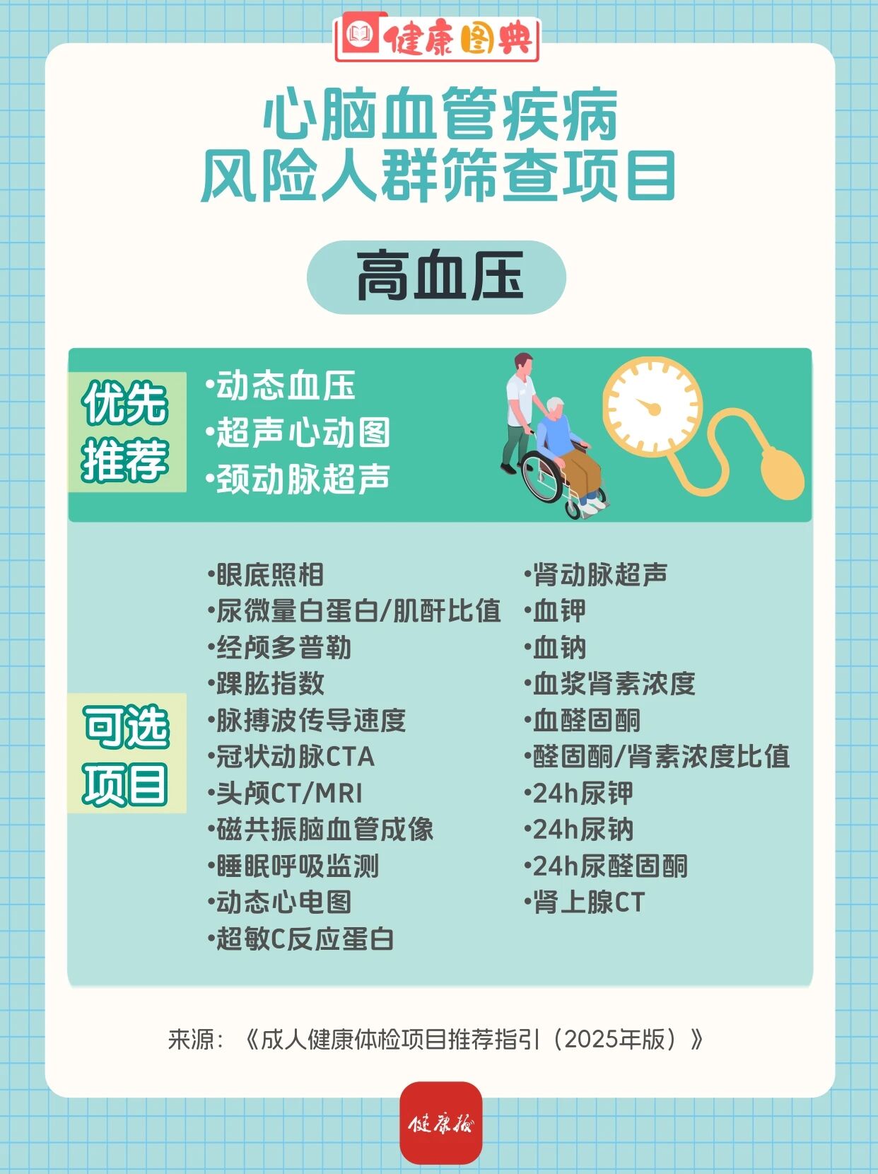 近期,国家卫生健康委办公厅印发《成人健康体检项目推荐指引(2025年版)》,进一步规范健康体检行为,维护受检者健康权益。根据新版《指引》,慢性病风险筛查项目包括心脑血管疾病风险人群筛查项目、常见恶性肿瘤风险人群筛查项目、其他慢性病风险人群筛查项目。本期健康图典栏目为大家详细解读心脑血管疾病风险人群和其他慢性病风险人群筛查项目。左右滑动上方图片可阅读相关内容。往期内容:成人基本体检项目该做哪些?这份权威《指引》给出答案!建议收藏→出品:健康报社制图/编辑:李诗尧(部分图片由AI生成)审核:徐秉楠