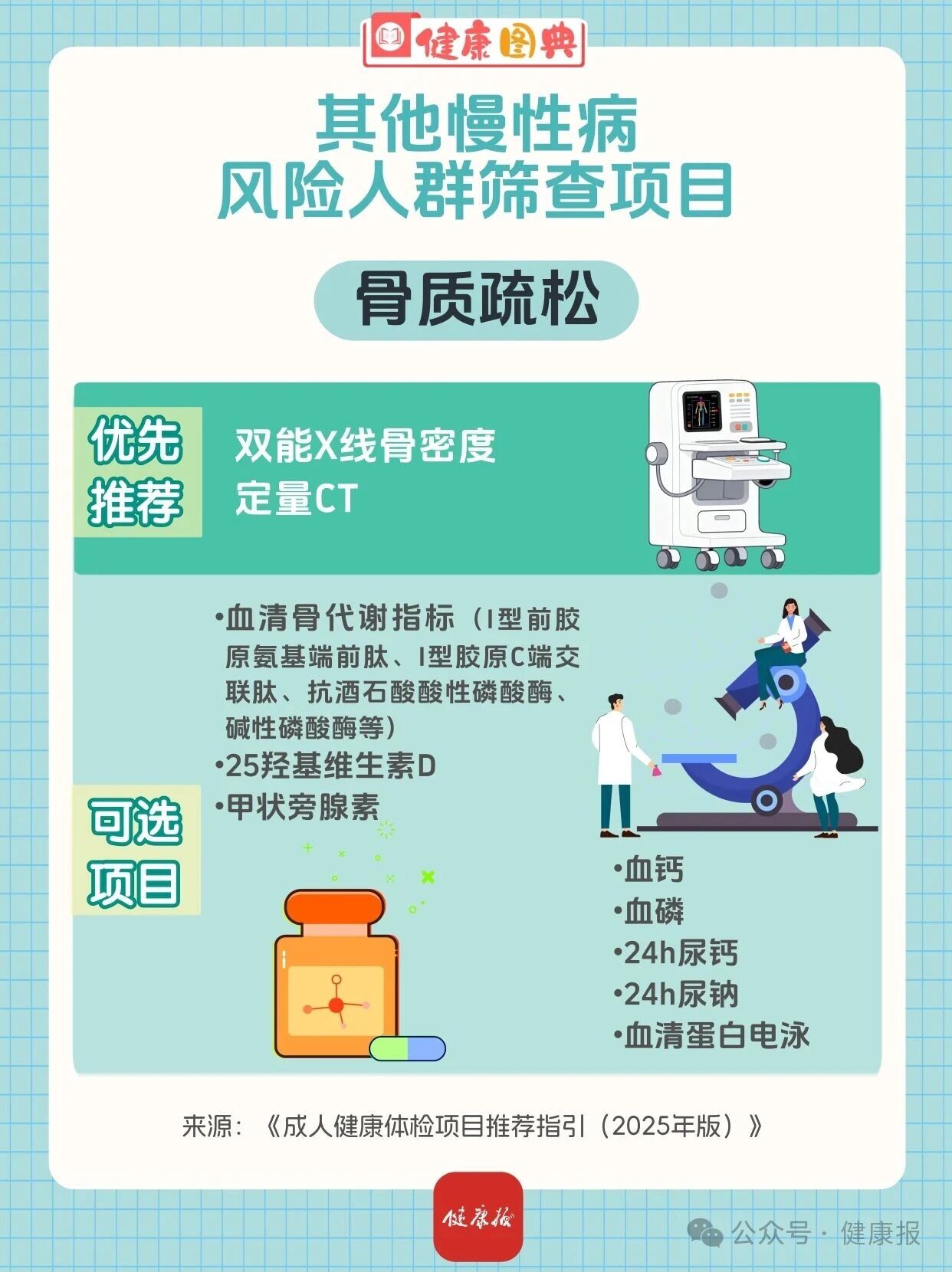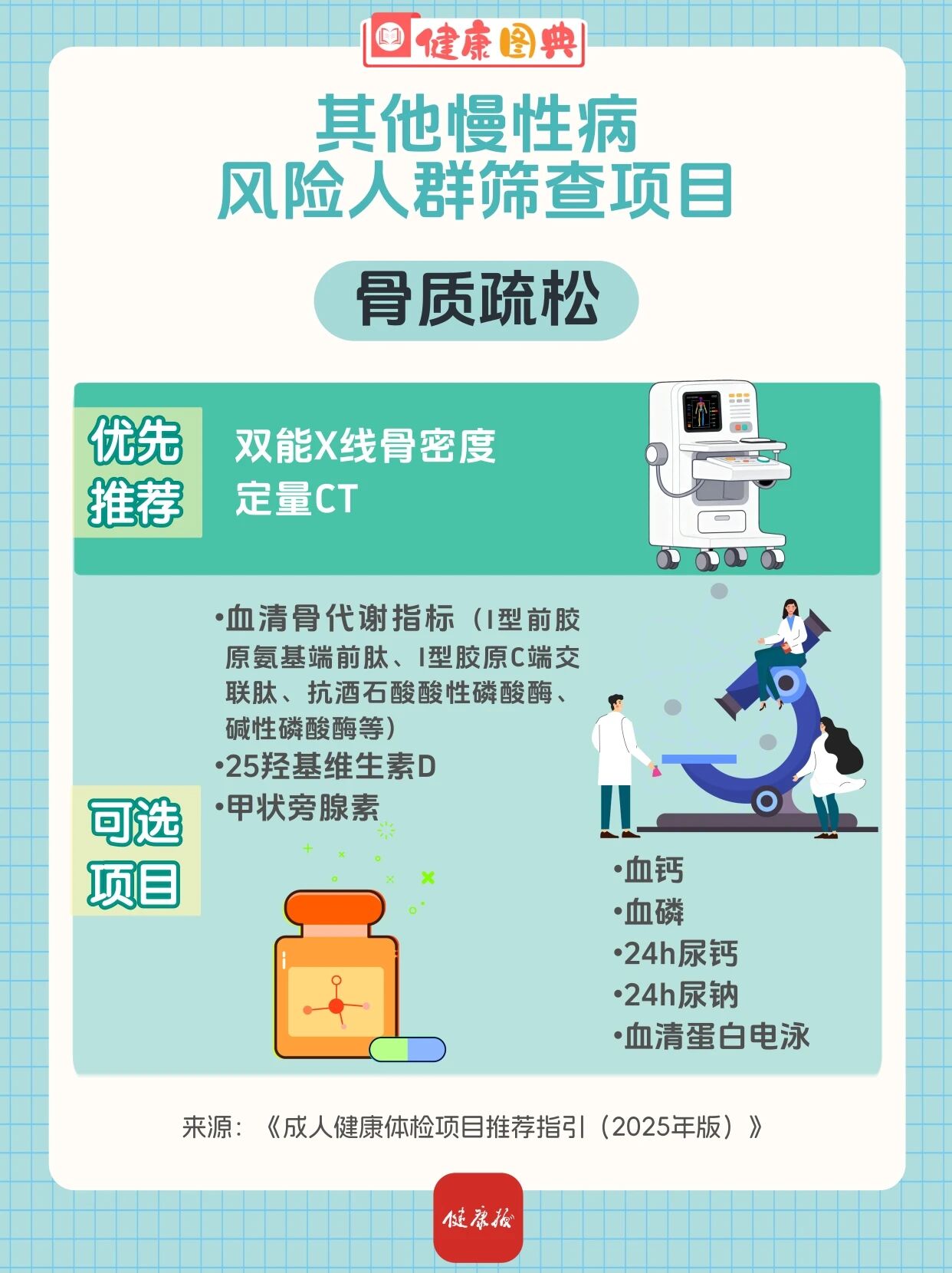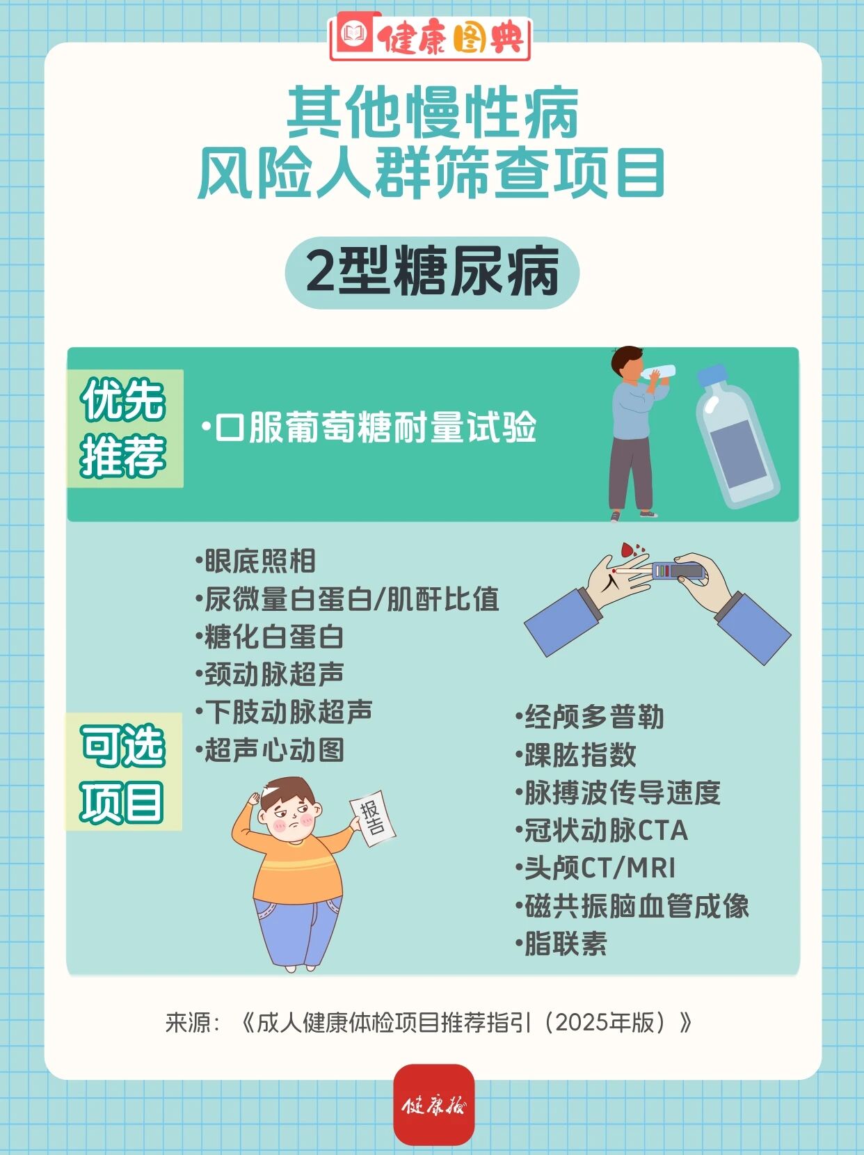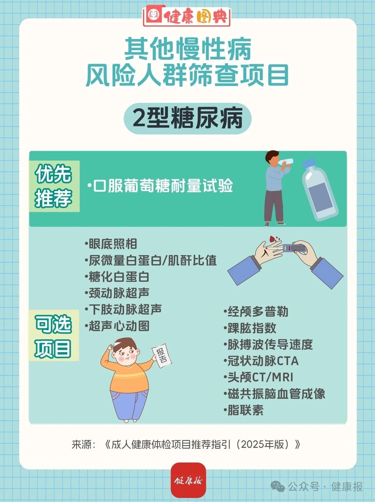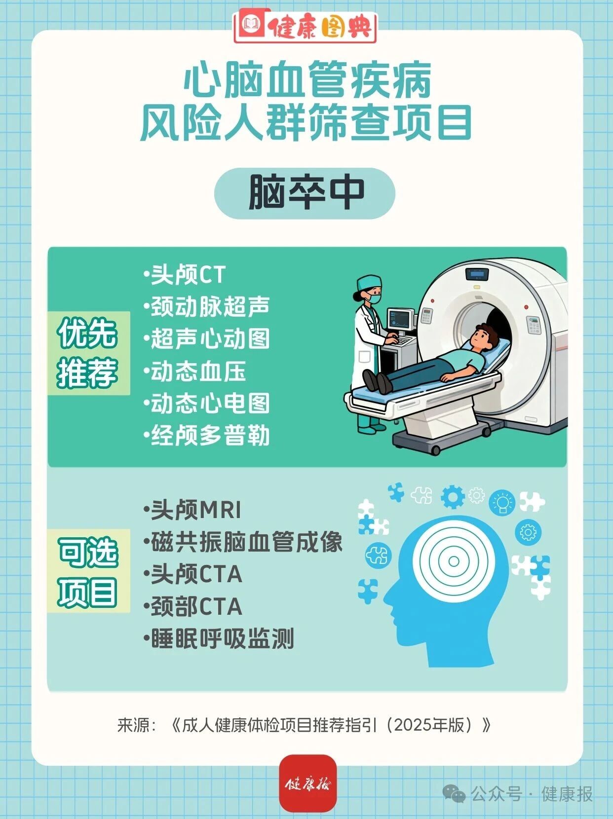 近期,国家卫生健康委办公厅印发《成人健康体检项目推荐指引(2025年版)》,进一步规范健康体检行为,维护受检者健康权益。根据新版《指引》,慢性病风险筛查项目包括心脑血管疾病风险人群筛查项目、常见恶性肿瘤风险人群筛查项目、其他慢性病风险人群筛查项目。本期健康图典栏目为大家详细解读心脑血管疾病风险人群和其他慢性病风险人群筛查项目。左右滑动上方图片可阅读相关内容。往期内容:成人基本体检项目该做哪些?这份权威《指引》给出答案!建议收藏→出品:健康报社制图/编辑:李诗尧(部分图片由AI生成)审核:徐秉楠