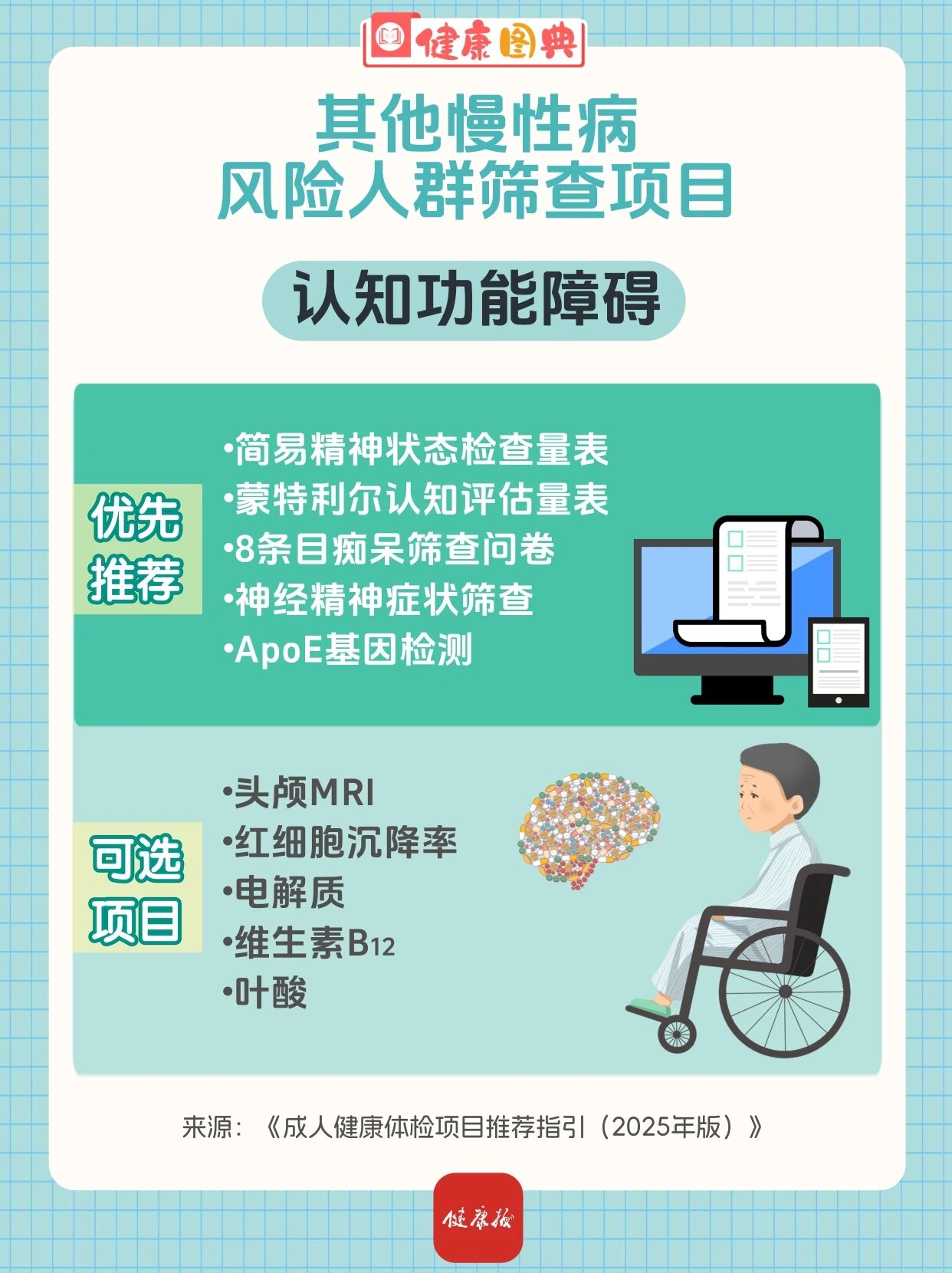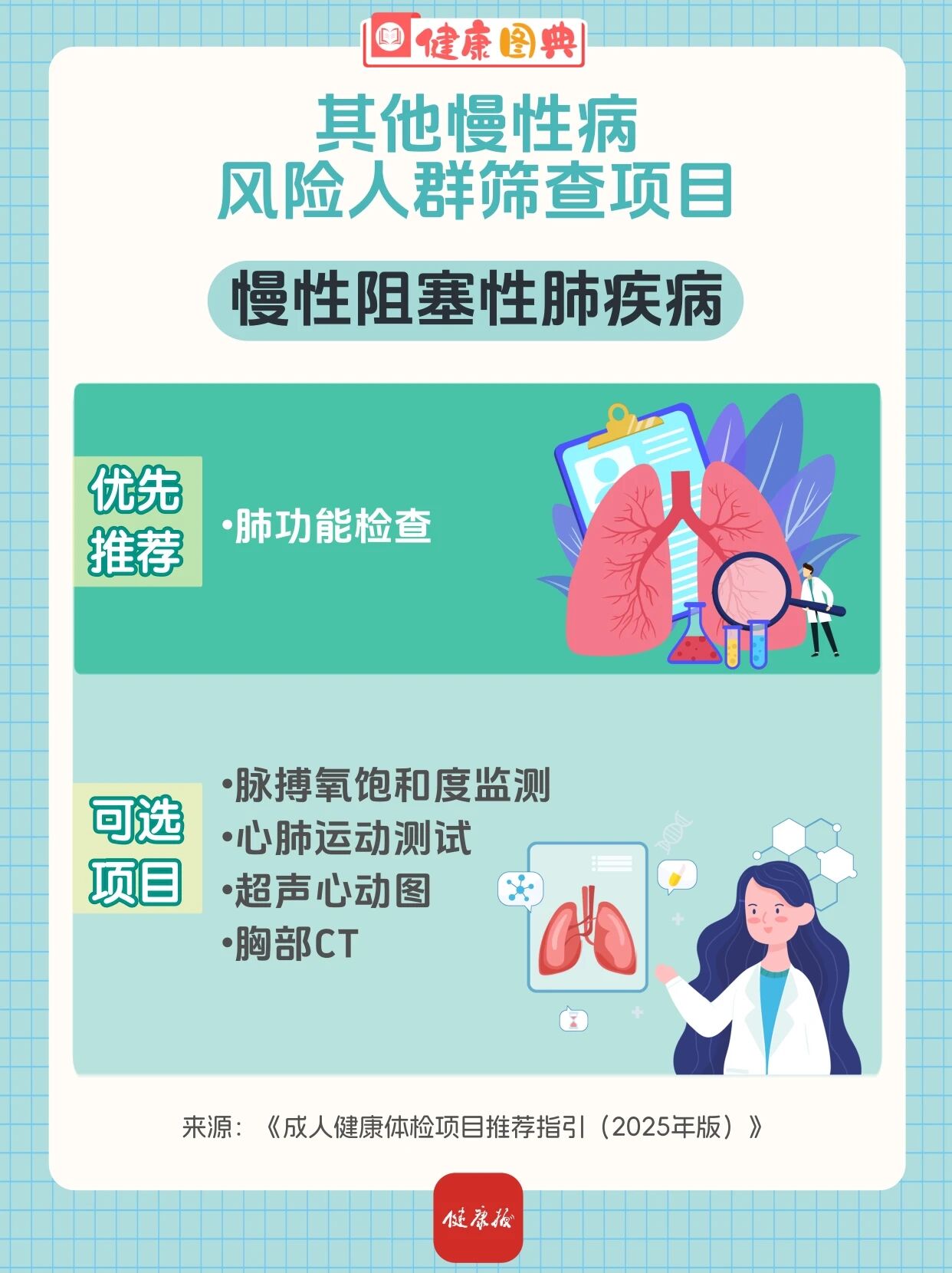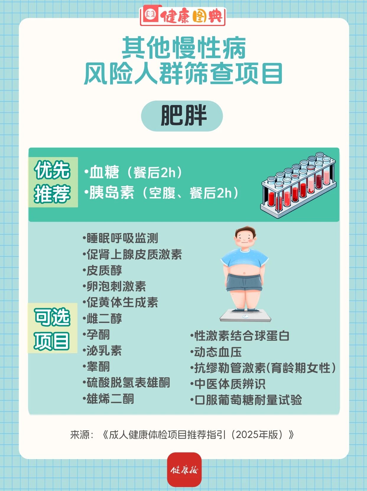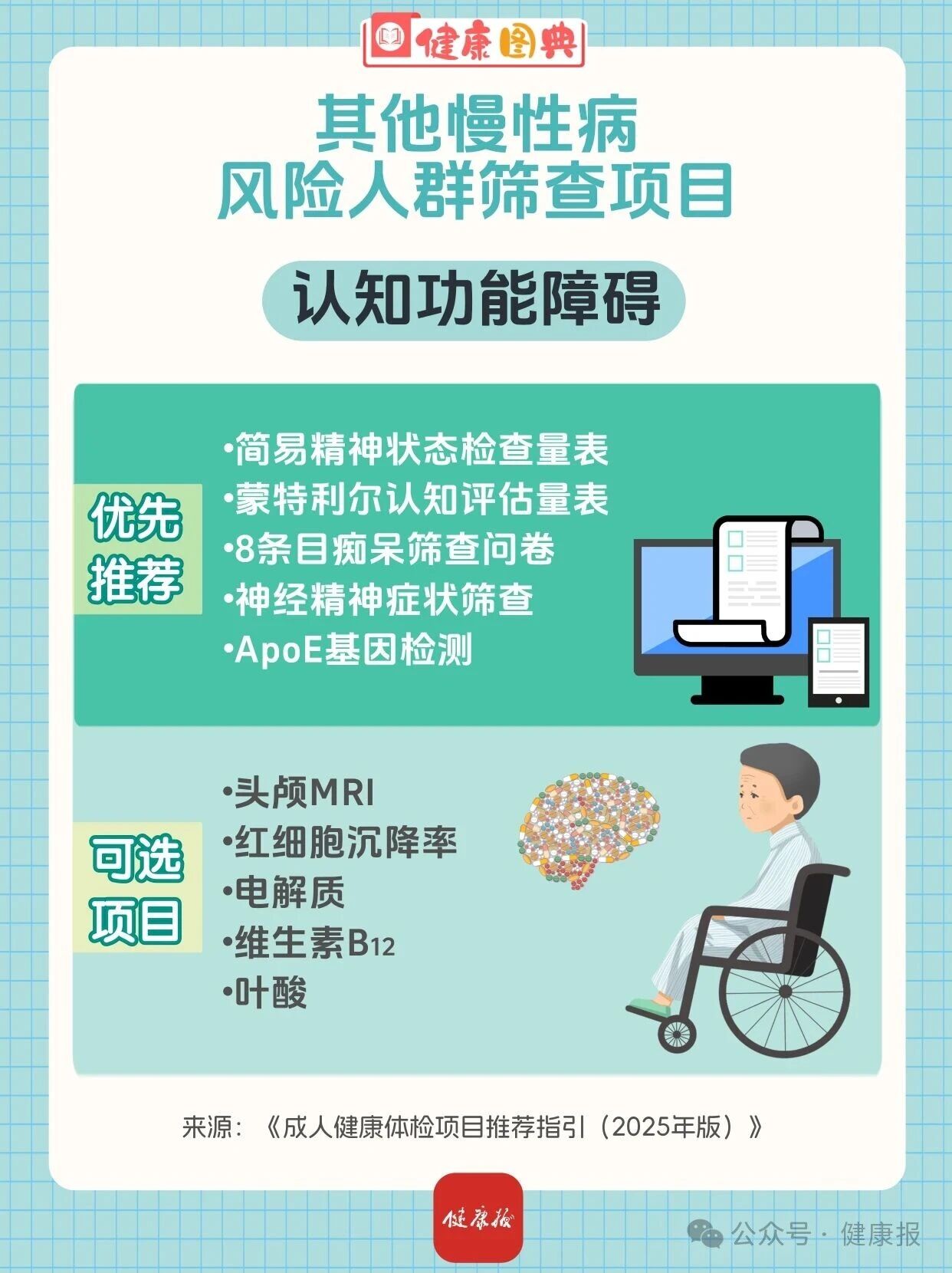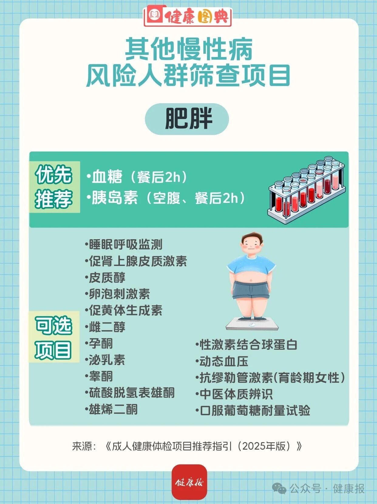 近期,国家卫生健康委办公厅印发《成人健康体检项目推荐指引(2025年版)》,进一步规范健康体检行为,维护受检者健康权益。根据新版《指引》,慢性病风险筛查项目包括心脑血管疾病风险人群筛查项目、常见恶性肿瘤风险人群筛查项目、其他慢性病风险人群筛查项目。本期健康图典栏目为大家详细解读心脑血管疾病风险人群和其他慢性病风险人群筛查项目。左右滑动上方图片可阅读相关内容。往期内容:成人基本体检项目该做哪些?这份权威《指引》给出答案!建议收藏→出品:健康报社制图/编辑:李诗尧(部分图片由AI生成)审核:徐秉楠
