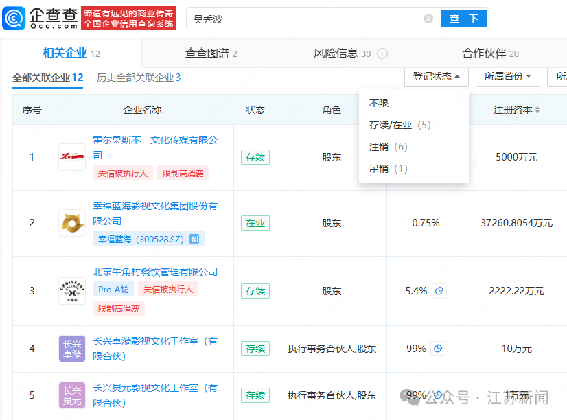 企查查信息显示,目前,吴秀波名下关联12家企业,仅5家为存续状态,包括霍尔果斯不二文化传媒有限公司、长兴卓漪影视文化工作室(有限合伙)等。