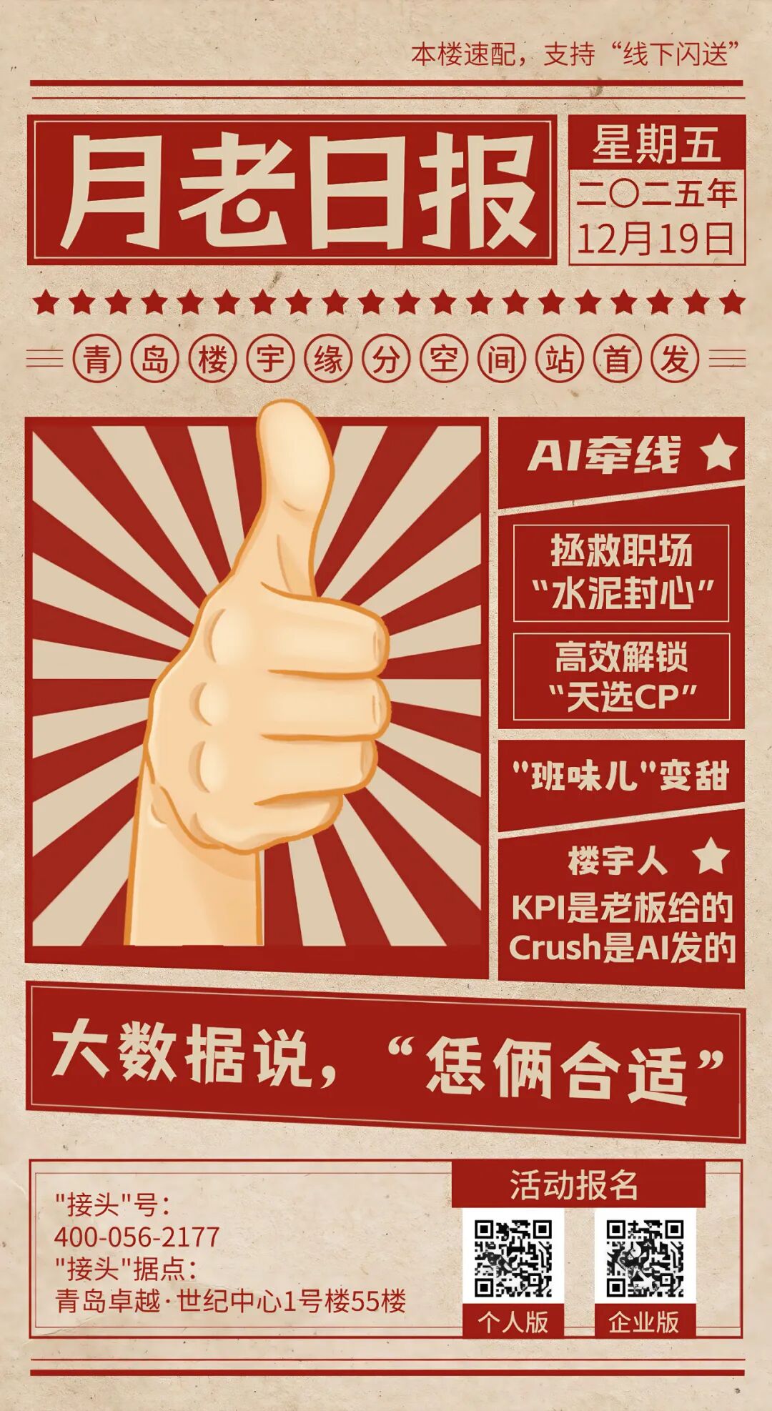 2025年12月19日,“甜蜜缘分空间站”首场活动将在青岛中央商务区卓越・世纪中心正式启动。本次活动助力寻觅爱情的人收获缘分,也让渴望友谊的人找到同行伙伴。