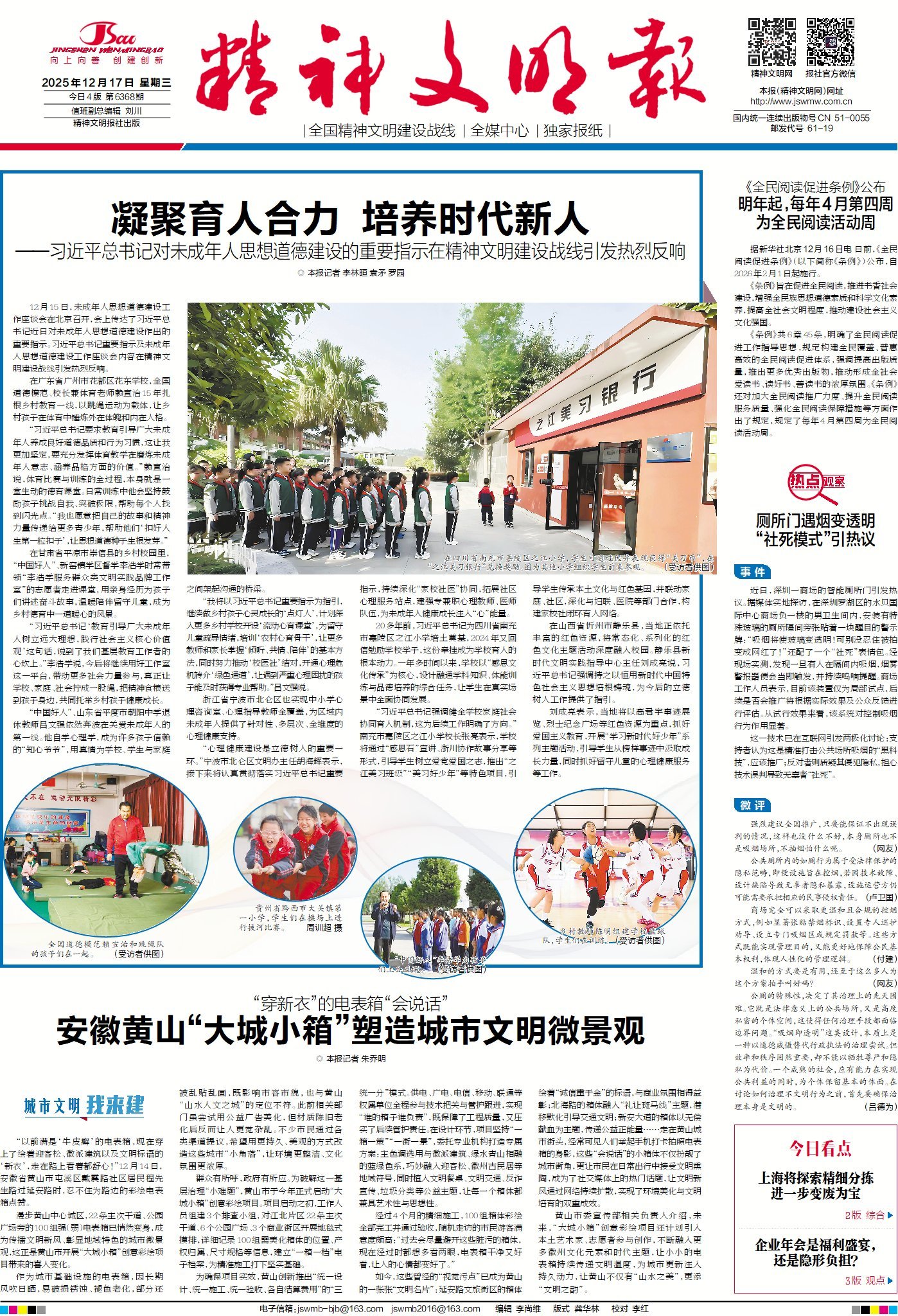 今日版面“早”知道:1版头条聚焦习近平总书记对未成年人思想道德建设作出的重要指示及座谈会在精神文明战线引起的热烈反响;《城市文明我来建》栏目带你走进安徽黄山,看“穿上新衣会说话”的电表箱被打造成城市文明微景观。《热点观察》栏目关注“吸烟会变透明”的公厕玻璃门,是控烟黑科技还是侵犯隐私?2版“综合”版关注上海垃圾分类,通过精细分拣,进一步实现“变废为宝”;3版《文明棱镜》栏目探讨年会到底是员工福利还是负担?怎样的年会才不至于成“年累”?