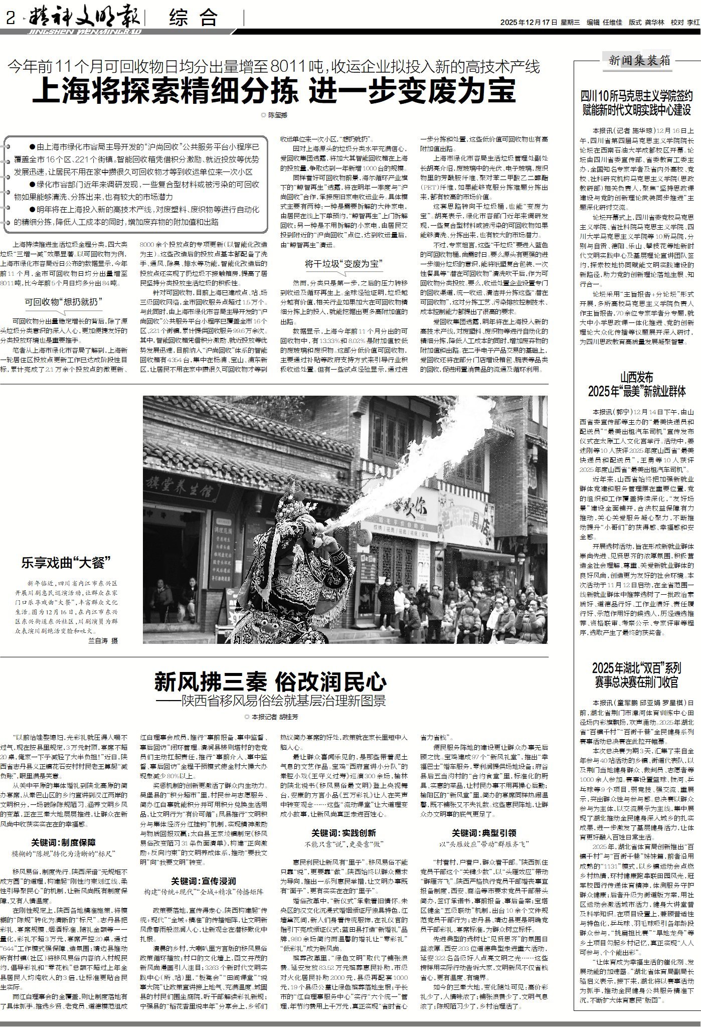 上海垃圾分类取得阶段性成果,如今正通过技术创新提升可回收物的精细分拣能力,推动“干垃圾变废为宝”。同时,企业投入自动化产线,对复合包装、废弃餐具等“潜在可回收物”进行高效分拣与清洁,挖掘其市场潜力。今日“综合”版带你一探究竟。