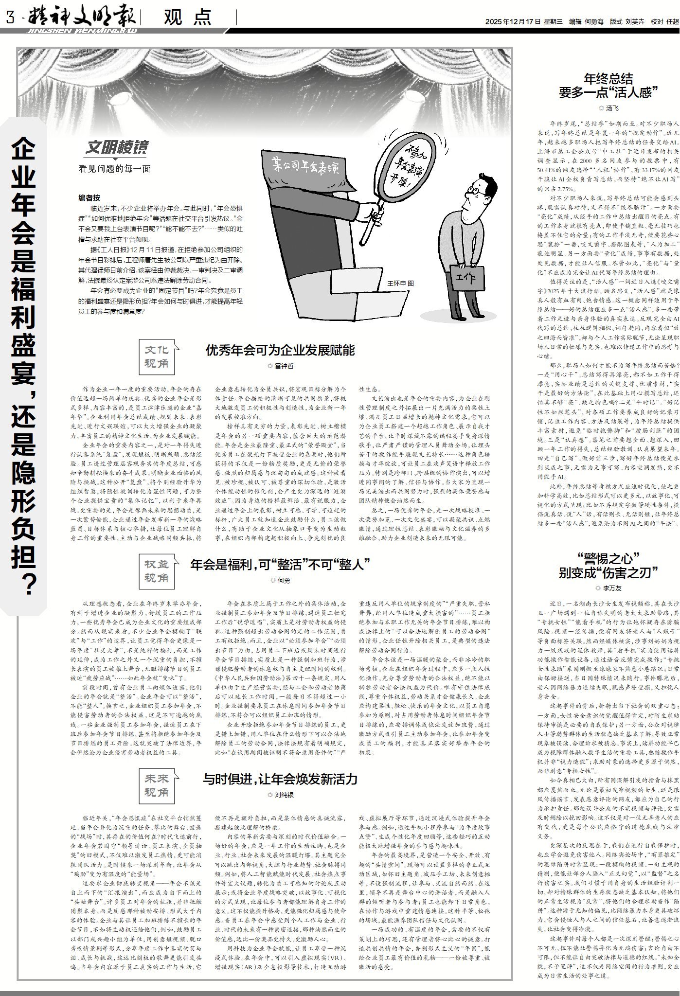 年底又到“年会季”。最近,“年会恐惧症”“如何优雅地拒绝年会”等话题在社交平台引发热议。工程师唐先生因拒绝参加年会节目排练,被公司以严重违纪为由开除,媒体报道这一案例更是引发关注。年会有必要成为企业的“固定节目”吗?年会到底是员工福利还是负担?怎样的年会才不至于成“年累”?一起来看今日《文明棱镜》观点碰撞。