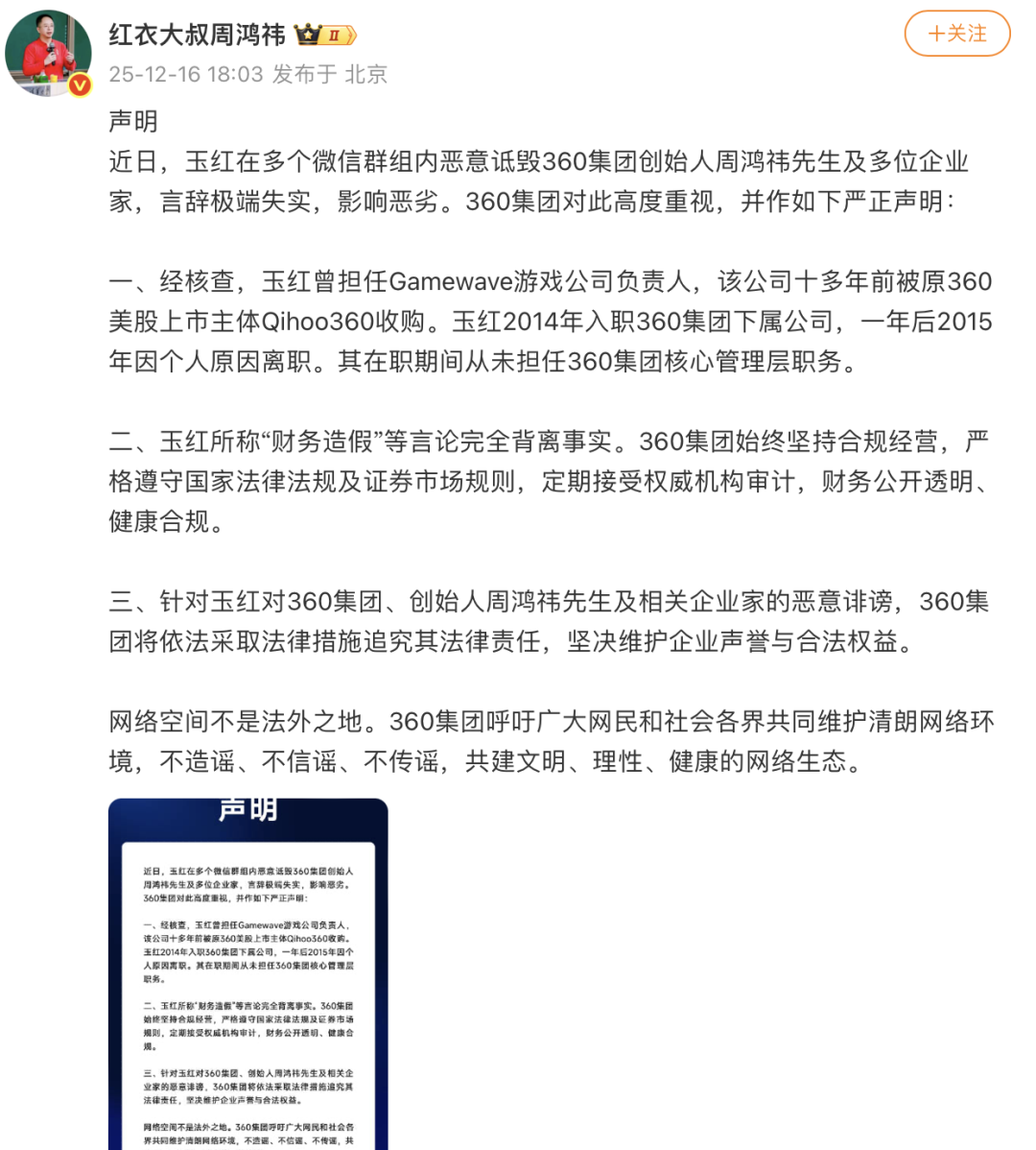 近日,玉红在多个微信群组内恶意诋毁360集团创始人周鸿祎先生及多位企业家,言辞极端失实,影响恶劣。360集团对此高度重视,并作如下严正声明: