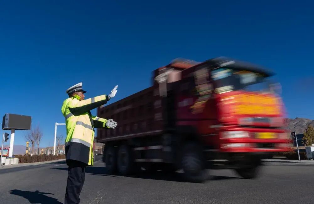 在西藏日喀则市区,交警指挥交通让完成救灾物资运输任务的救援车辆顺利出城。新华社发