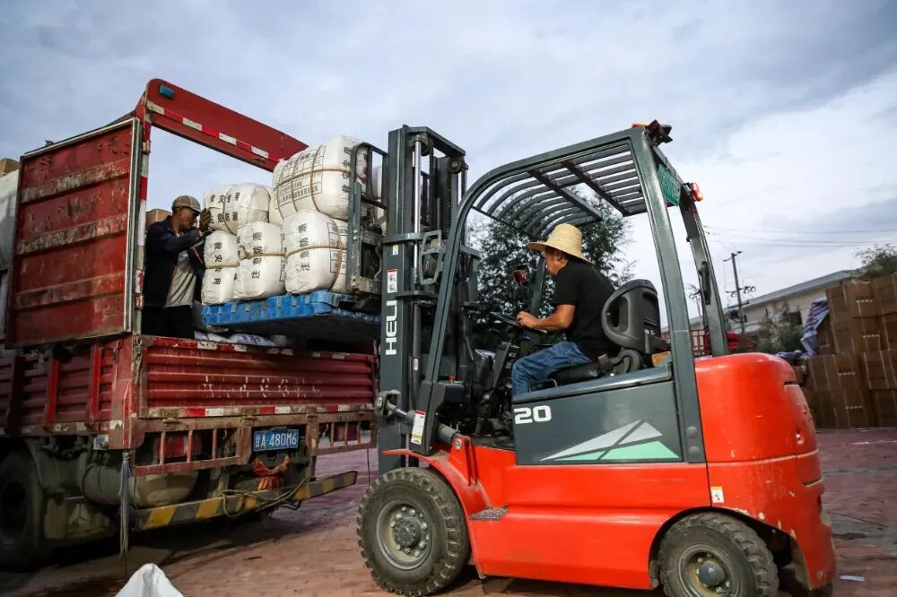 在甘肃榆中县救灾物资储备服务中心,工作人员将救灾物资装车。新华社发