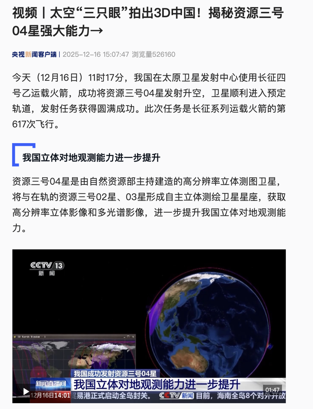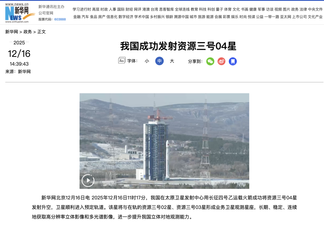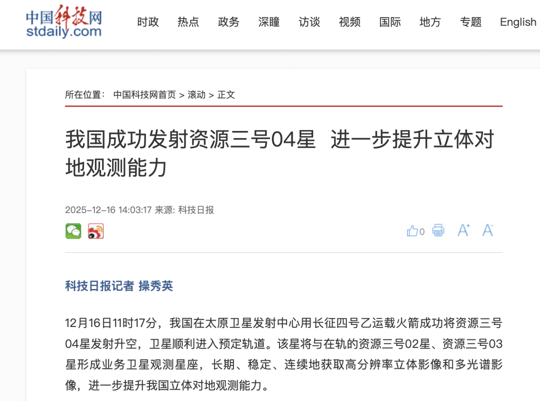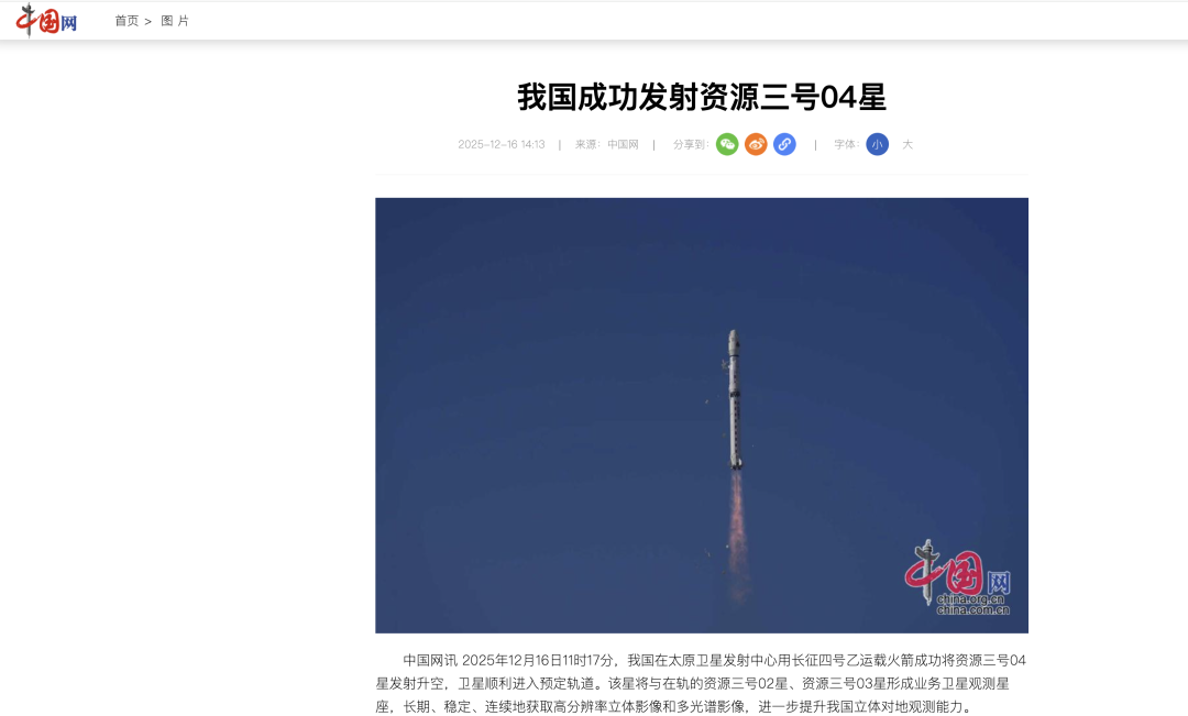 12月16日11时17分,我国在太原卫星发射中心用长征四号乙运载火箭成功将资源三号04星发射升空,卫星顺利进入预定轨道。新华网、人民网客户端、人民网、央视《正点财经》《新闻30分》、央视新闻、中国网、中国科技网、新京报客户端等媒体进行了报道。