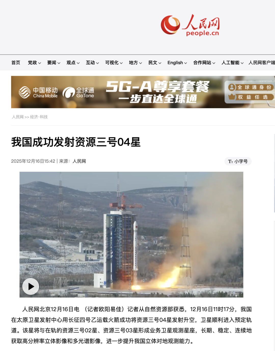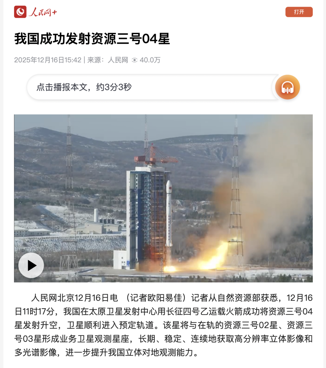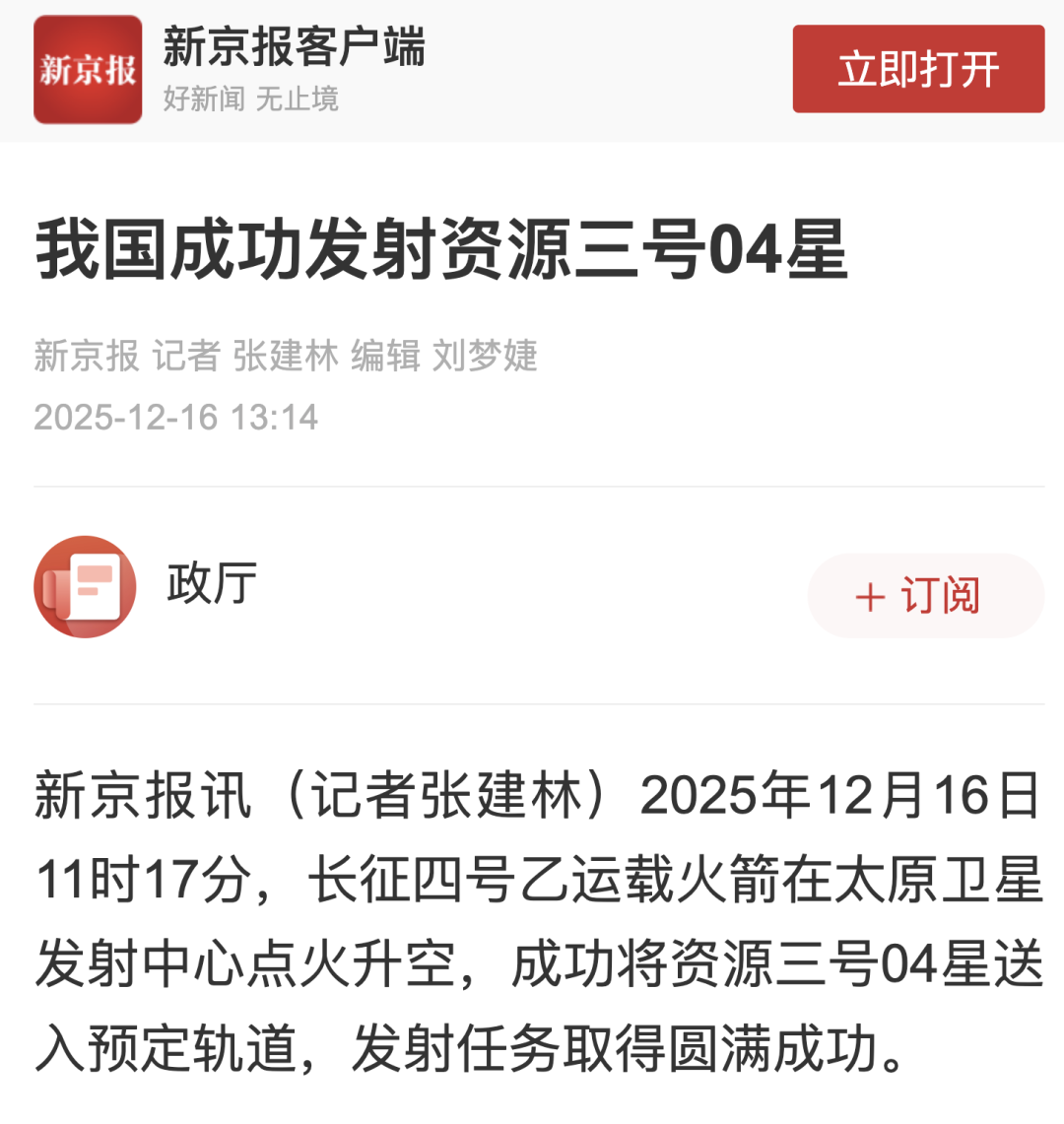 12月16日11时17分,我国在太原卫星发射中心用长征四号乙运载火箭成功将资源三号04星发射升空,卫星顺利进入预定轨道。新华网、人民网客户端、人民网、央视《正点财经》《新闻30分》、央视新闻、中国网、中国科技网、新京报客户端等媒体进行了报道。