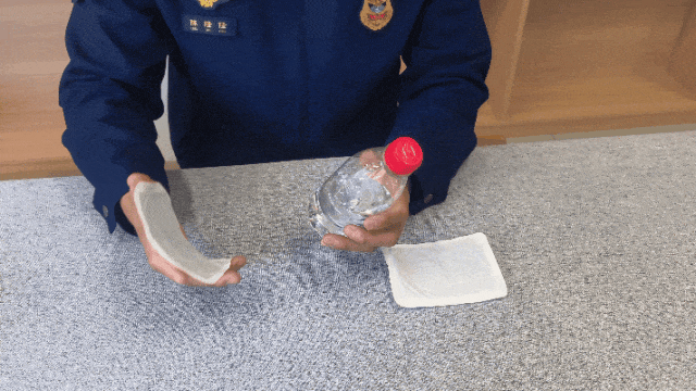 消防员将暖宝宝按照使用说明均撕下贴纸,把暖宝宝包裹在矿泉水外。