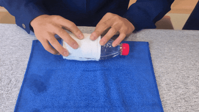 然后用一条毛巾裹住,用来模拟人体穿衣状态下使用暖宝宝的效果。