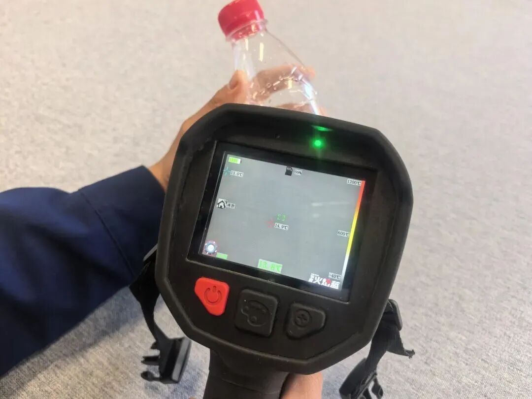 实验正式开始,消防员先用热成像仪测出矿泉水表面的温度为13.8℃。
