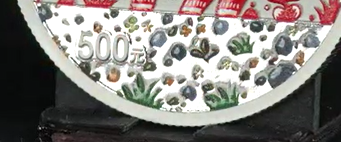 这个区域的工艺处理尤为精妙,镜面与喷砂的巧妙结合,营造出大地坚实而又富有光泽的质感,这样不仅增加了画面的纵深感,更让币面拥有了更加丰富的视觉层次。金属光泽与彩色石块相映成趣,既鲜艳夺目又不失典雅气质。