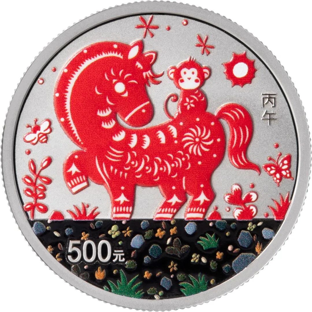 2026中国丙午(马)15克圆形铂币背面图案为剪纸马造型,衬以猴子、花草等组合设计,并刊“丙午”字样及面额。