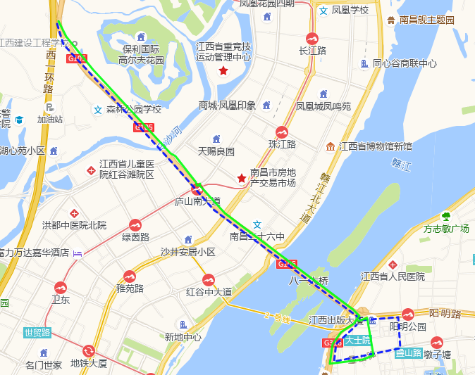 去:军转大厦—胜利路—叠山路—八一桥—昌北—庐山南大道—舍里甲老转盘处调头—瀛上老路口;