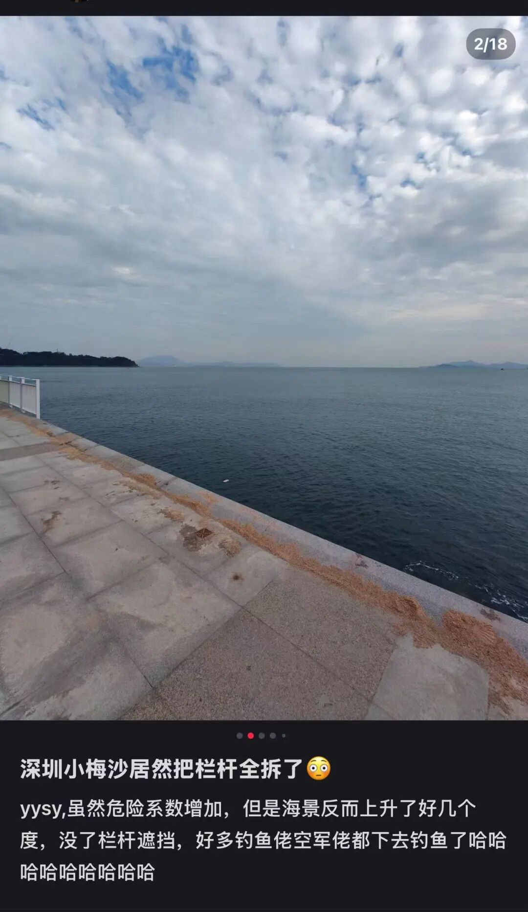 近日,有网友发帖称,深圳小梅沙海滨栈道护栏被拆除,无遮挡海景虽获好评,但有不少人在海边垂钓,引发公众对于安全问题的关注。为此,盐田区相关职能部门回应称,护栏拆除系台风损毁后修复所需,并提醒广大市民远离施工封闭区域,确保自身安全。