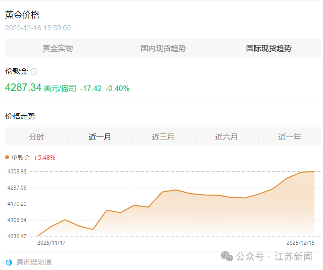 12月16日晚,金价反转,黄金直线拉升。截至发稿,现货黄金报4322美元/盎司,报涨0.41%。