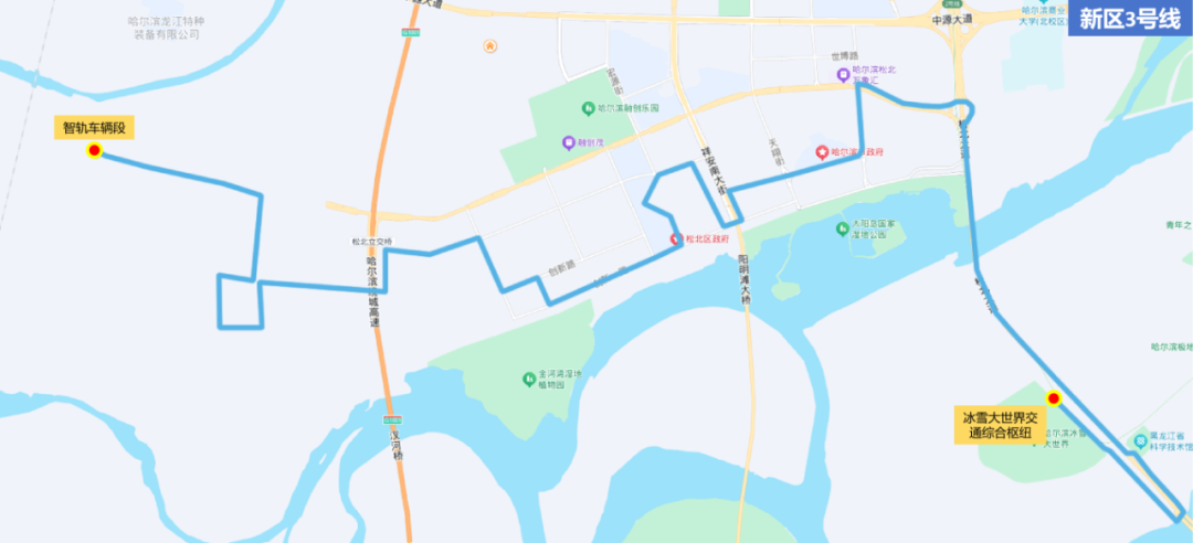 其一为新区3路,为常规收费线路,票价2元/人次。线路走向为,由冰雪大世界B2停车场(交通综合枢纽) 发车,经雪景街、松北大道、世茂大道(地铁4号口)、市政府,至智轨车辆段终点后原路返回。运营时间为首车6时,末车19:30。