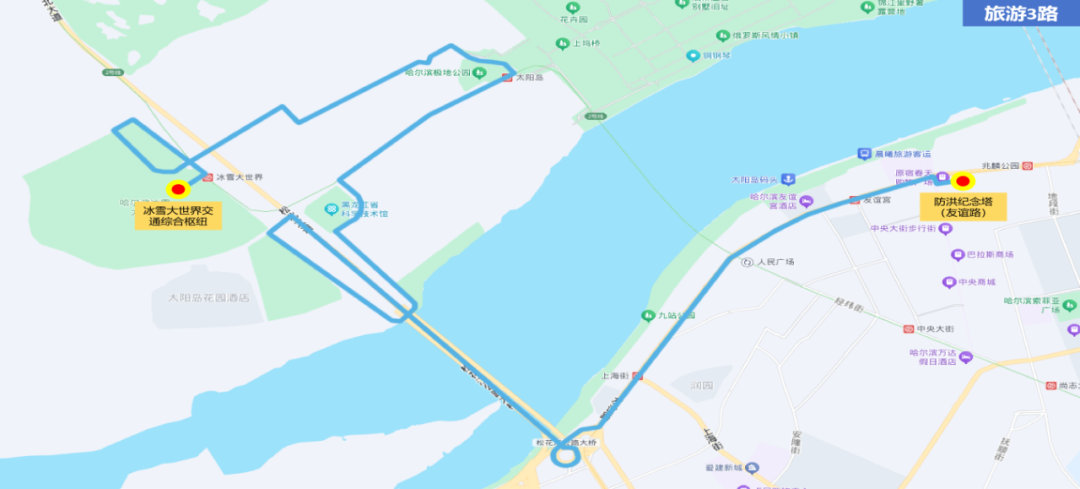 其二为旅游3路,为常规收费线路,票价2元/人次。线路走向,为由冰雪大世界B2停车场(交通综合枢纽) 发车,经雪景街、科技馆、太阳大道、极地馆、月亮一路、月亮二路、天马街、天马隧道、雪花路、松北大道、公路大桥、友谊路,至中央大街终点。服务时间为首车7时,末车20时。