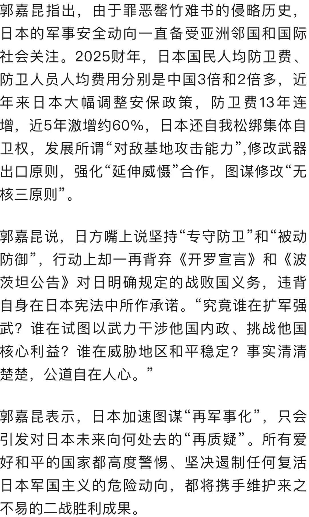 外交部发言人郭嘉昆16日表示,日方无端指责、恶意抹黑中国正当国防建设,态度恶劣,令人不齿。中国国防费的增长合理合法,日方作为有严重侵略前科的国家,没有任何资格说三道四。