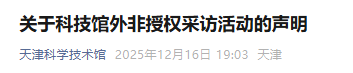 近期,我馆接到部分观众反映,有社会人员以媒体及记者采访名义,在科技馆外围公共区域对参观学生、家长及游客进行随机询问。此类行为均非我馆组织或获得任何形式的授权,与我馆无任何关联,其采访内容、观点及可能产生的纠纷均与我馆无关。为维护广大参观者的合法权益及信息安全,我馆特此提醒您: