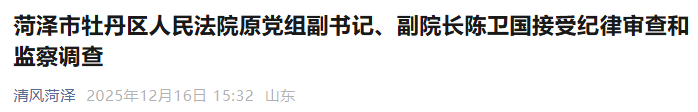 菏泽市牡丹区人民法院原党组副书记、副院长陈卫国涉嫌严重违纪违法,目前正接受菏泽市牡丹区纪委监委纪律审查和监察调查。