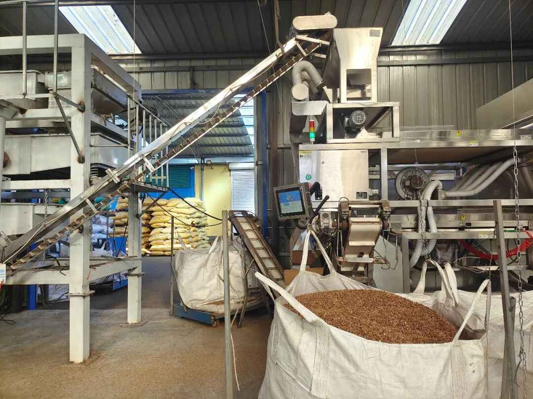铁岭县李千户镇深山里榛子专业合作社的生产车间里,传送带正在把榛子运送到机器前进行仁与壳分离操作。摄影:张广梅