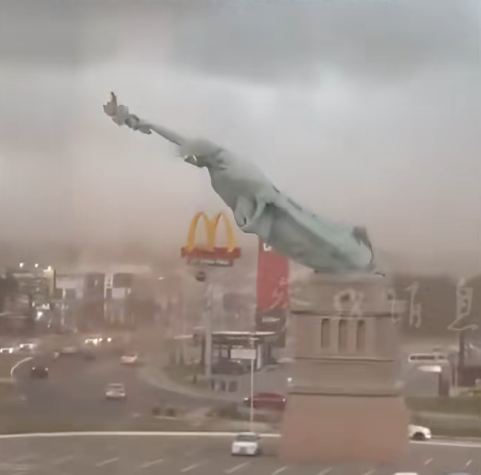 2025年12月15日,有视频传自由女神像遭遇强风轰然倒塌,雕像高举火炬的手臂被摔碎。