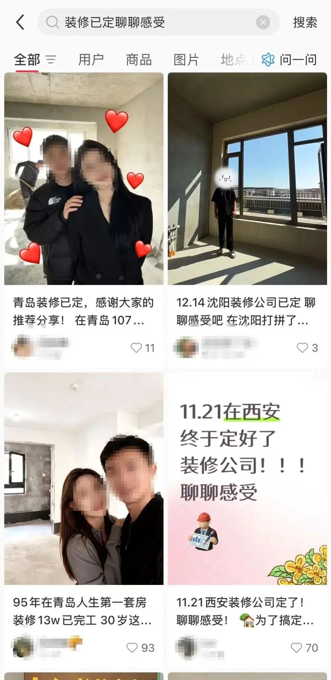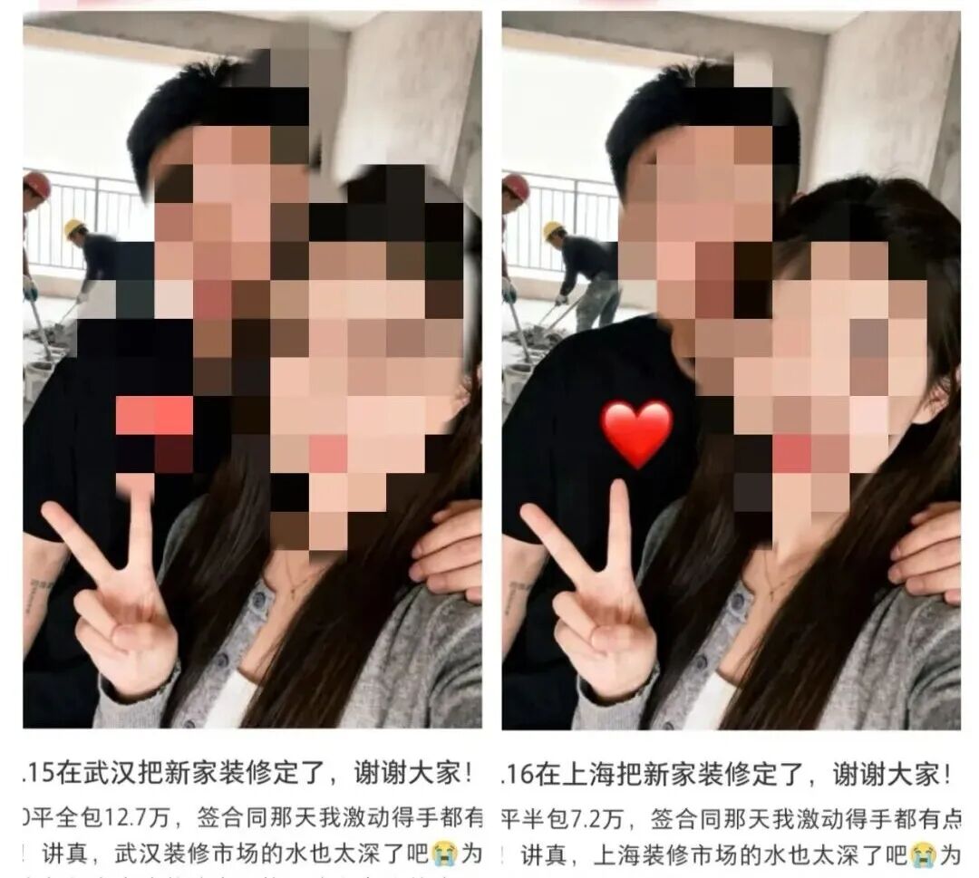 “良辰吉日,开工大吉”“遇到良心装修公司,89平9.3w全包完工”……高度同质化的内容,搭配一对笑容灿烂的“夫妻”站在新家门口的图片,向网友分享自家的装修“干货”经验。近期,类似的帖子在许多社交平台高频出现。