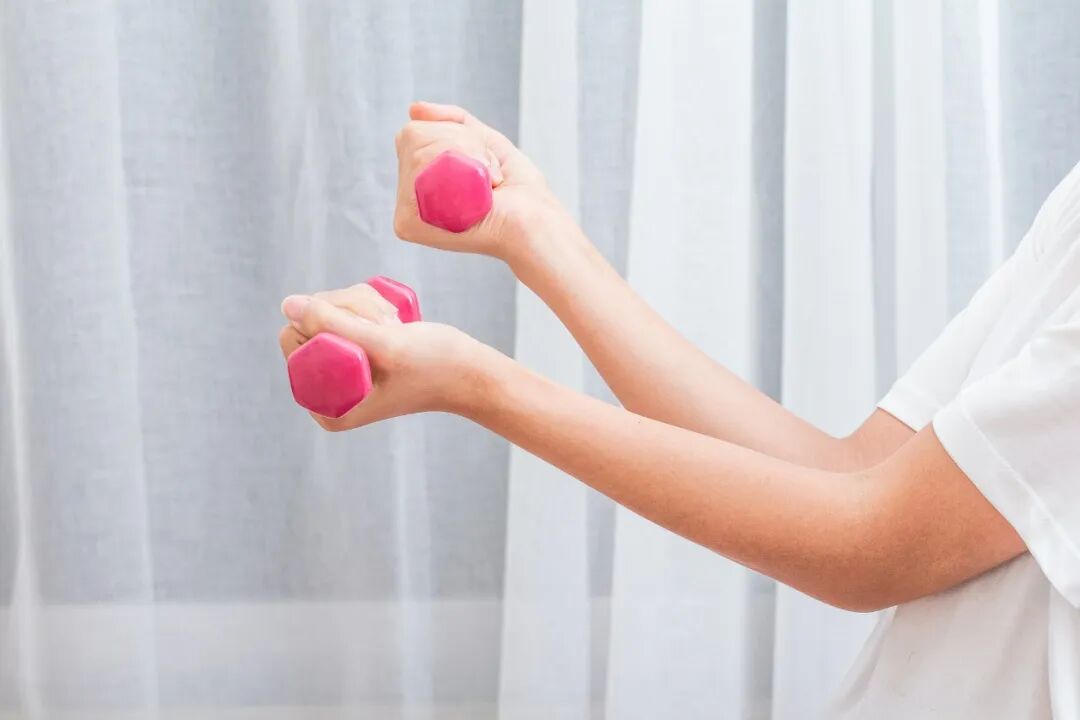 坐或站立,双手持哑铃或水瓶举至肩高,掌心向前,向上推至头顶直至肘部最终伸直,缓慢放下。这个动作可以改善肩颈紧张,加强上肢的肌肉力量。