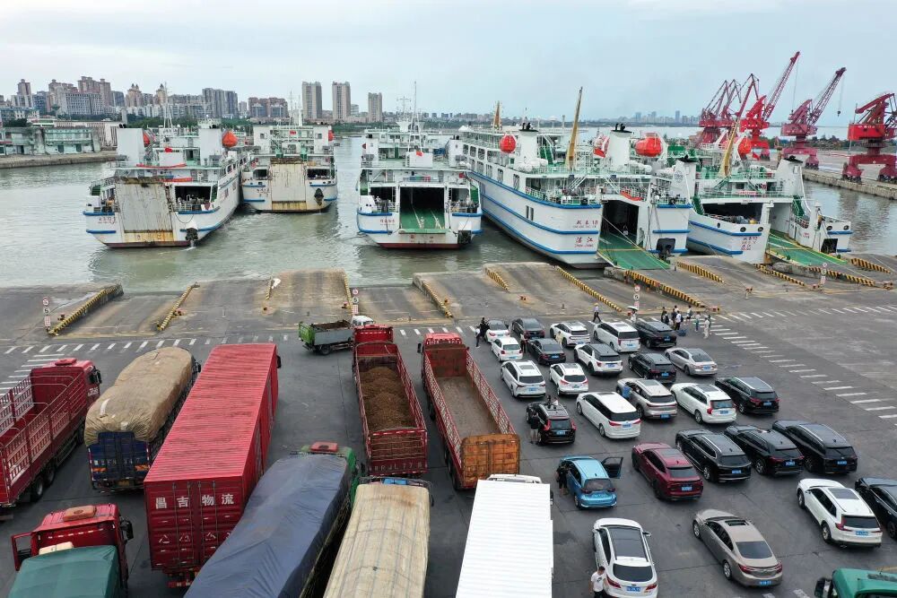 在海南省海口市秀英港,客滚船在装卸乘客、车辆(无人机照片)。新华社记者 郭程 摄
