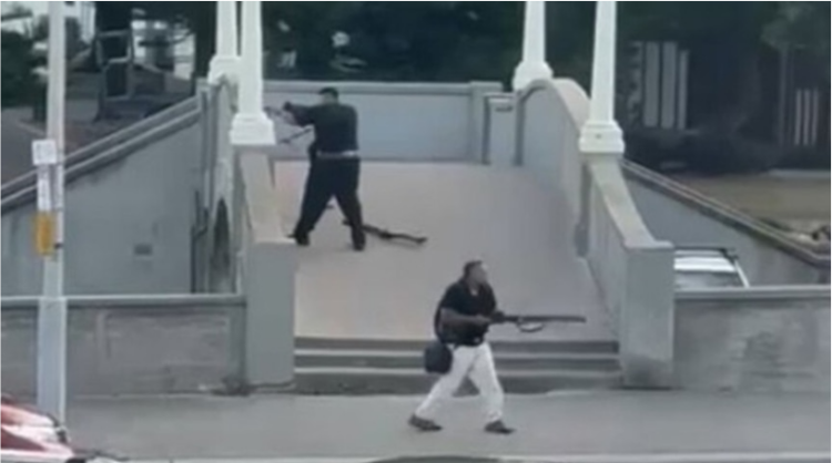 当地时间12月14日,两名嫌疑人在邦迪滩持枪对准人群。 图源:澳大利亚广播公司