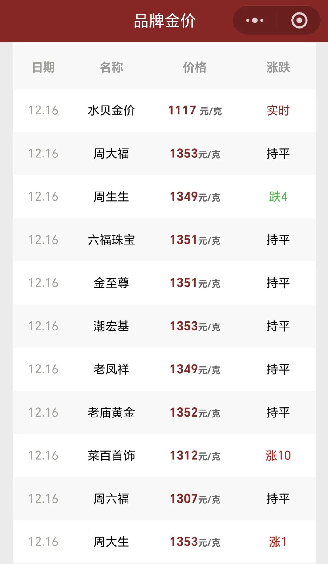 国内品牌金饰价格也随着同步上调,12月15日,周生生、周大福等头部品牌金饰价格在集体站上1353元/克,创下年内罕见的“五连涨”,较年初约800元/克的价格暴涨近70%。