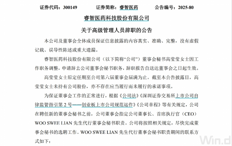 12月12日晚,睿智医药(300149.SZ)发布公告称,董事会秘书高莹莹因工作职务调整,申请辞去公司董事会秘书职务,辞职报告自送达董事会之日起生效。