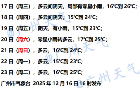 广州市气象台预计,12月16日夜间,广州云量增多,部分地区有零星小雨。12月17日—18日,多云间晴,气温小幅波动。受南支槽和低层南风增大影响,12月19日广州阴天有小雨。