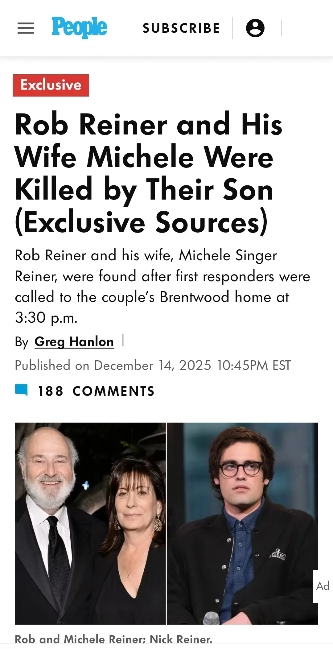 当地时间12月14日,导演罗伯·莱纳与妻子米歇尔·辛格·莱纳被他们的女儿罗米发现死于洛杉矶的家中。当天下午3点30分左右,警方接到医疗救助电话后赶往现场,随后发现了这对夫妇的遗体。
