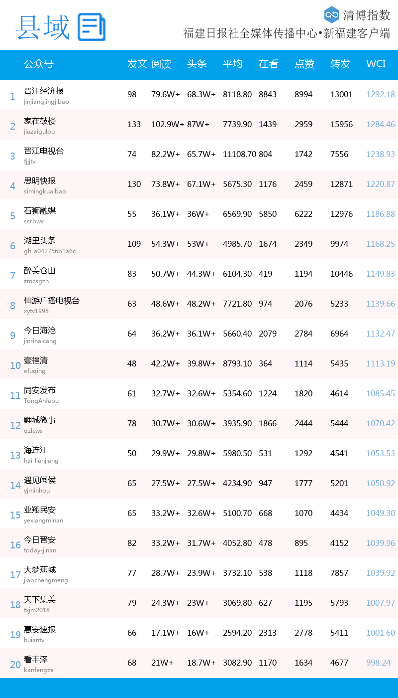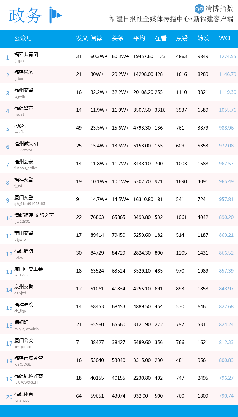 福建微信影响力指数,由福建省委宣传部指导、福建日报社主办、新福建客户端发布,由清博智能提供数据支持。