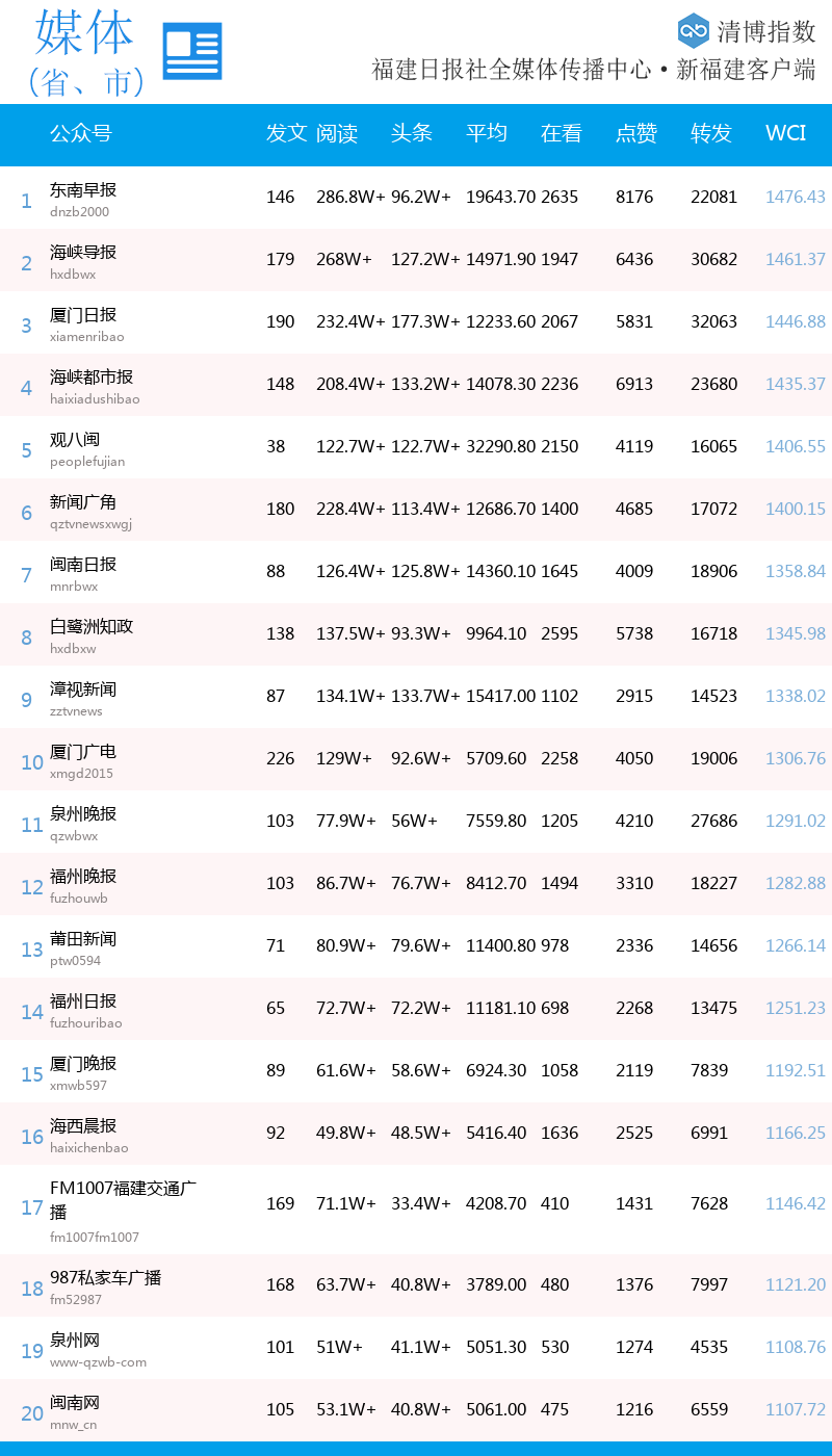 综合数据计算采用业界公认WCI指数。清博指数是第三方新媒体大数据查询平台、“两微一端”新媒体大数据平台,其独有的WCI、BCI、TGI算法公式已被多家央企、500强企业引用。《福建日报》是福建地区最具影响力与公信力的主流媒体之一。由福建日报•新福建客户端发布、清博智能提供数据支持的福建地区微信影响力指数,致力于打造福建省最权威、最公正的微信影响力指数。