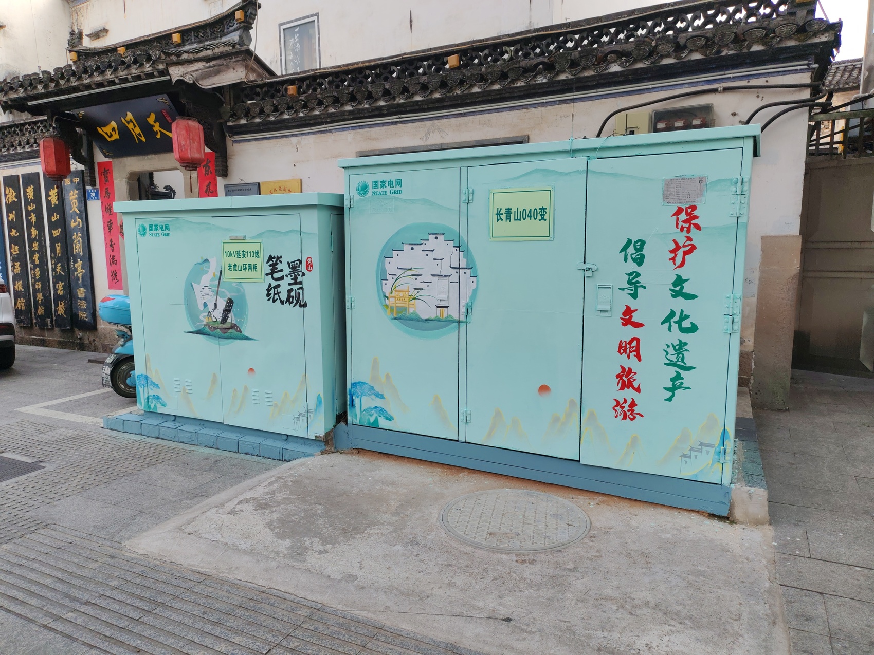 为确保项目实效,黄山创新推出“统一设计、统一施工、统一验收、各自结算费用”的“三统一分”模式。供电、广电、电信、移动、联通等权属单位全程参与技术把关与管护跟进,实现“谁的箱子谁负责”,既保障了工程质量,又压实了后续管护责任。在设计环节,项目坚持“一箱一策”“一街一景”,委托专业机构打造专属方案:主色调选用与徽派建筑、绿水青山相融的蓝绿色系,巧妙融入迎客松、徽州古民居等地域符号,同时植入文明餐桌、文明交通、反诈宣传、垃圾分类等公益主题,让每一个箱体都兼具艺术性与思想性。